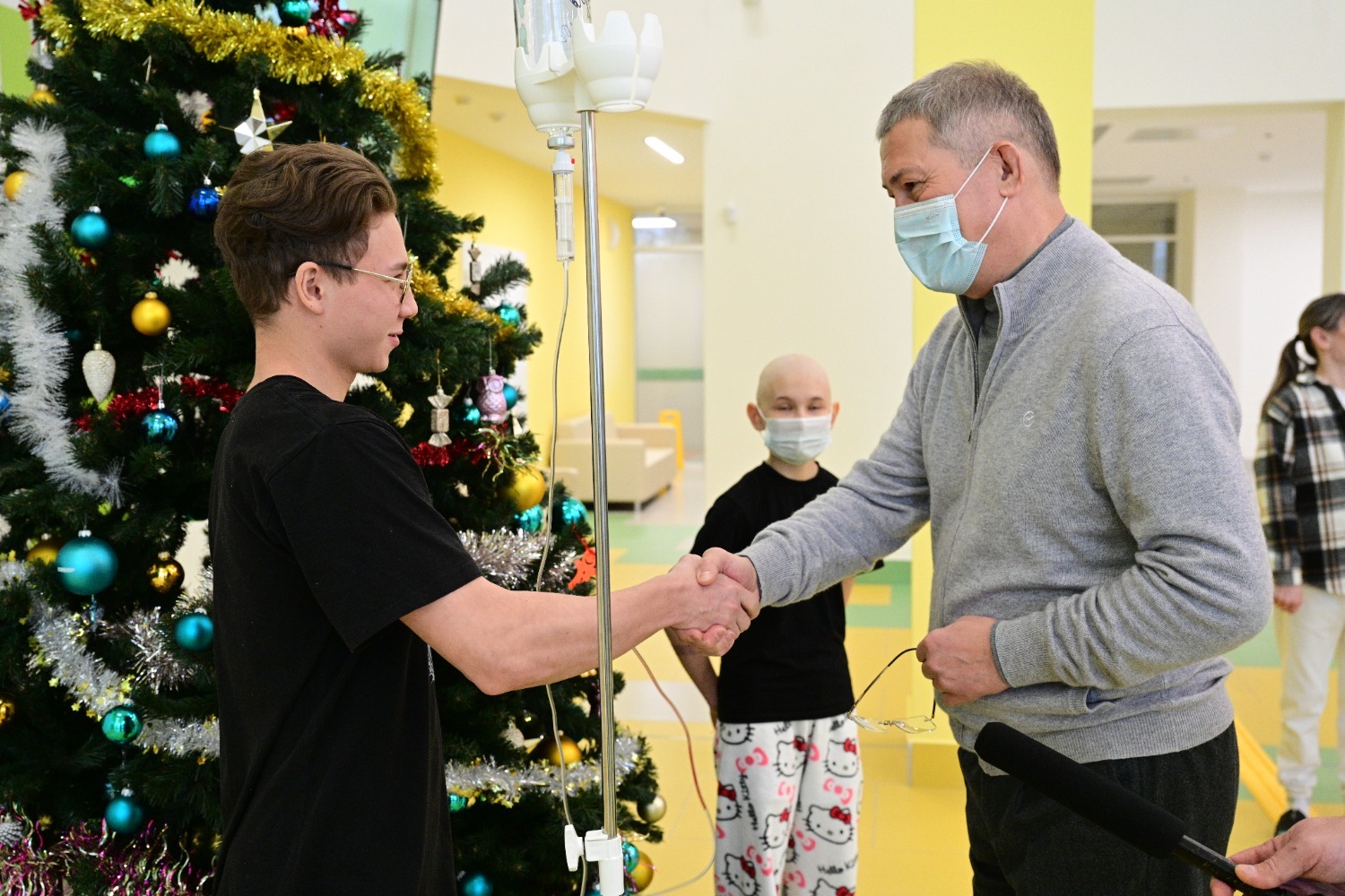 Руководитель республики поздравил их с наступающим Новым годом, пожелал детишкам скорейшего выздоровления и передал им новогодние подарки. Родители поблагодарили Радия Хабирова за его визит и возможность проходить лечение в таком уникальном центре.