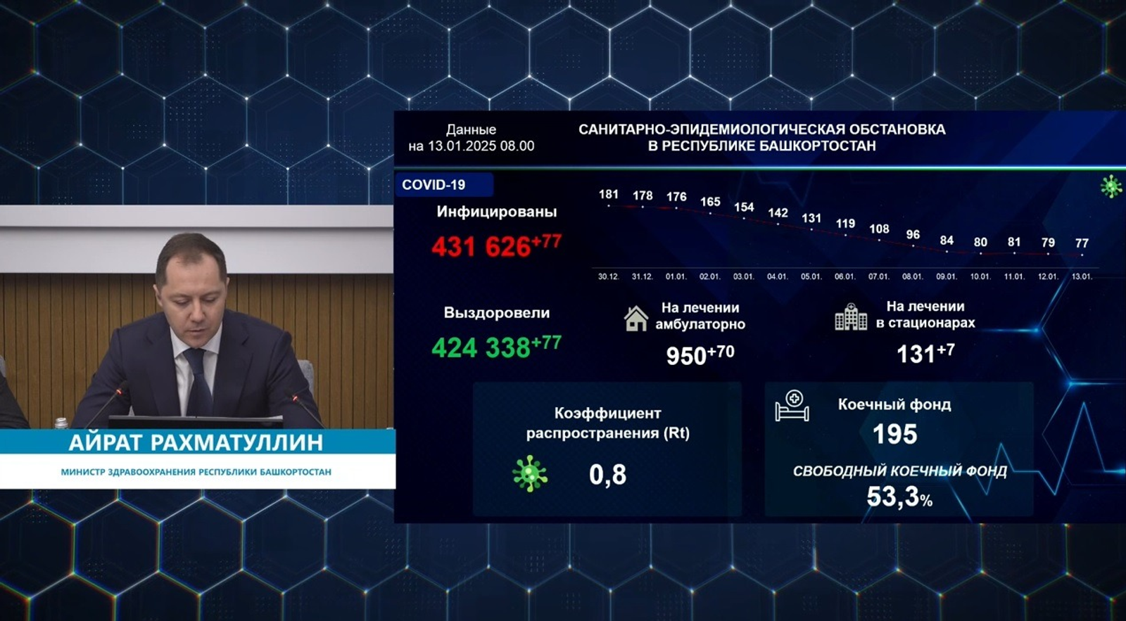 В Башкирии за минувшие сутки выявлены 77 случаев заболевания коронавирусной инфекцией. Об этом сегодня на оперативном совещании правительства в ЦУРе сказал министр здравоохранения республики Айрат Рахматуллин.