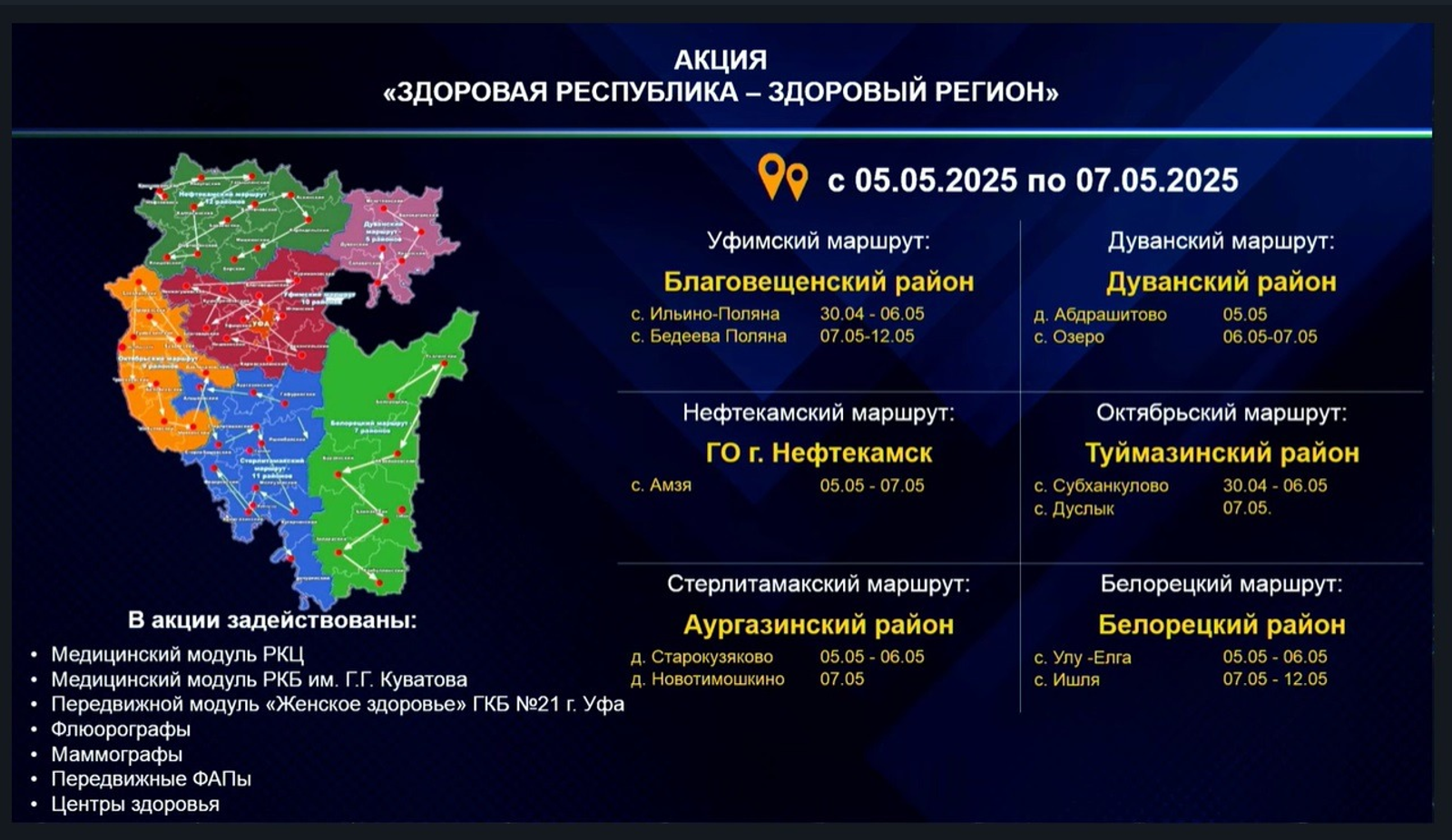 Напомним, как ранее сообщал «Башинформ», на этой неделе передвижные медицинские комплексы приедут в Белорецкий, Дуванский, Туймазинский, Аургазинский, Благовещенский районы и в село Амзя города Нефтекамска. Подробнее с графиком можно ознакомиться здесь.
