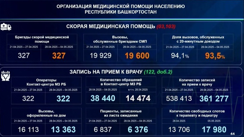 Айрат Рахматуллин доложил о работе скорой медицинской помощи. По его словам, на прошлой неделе в регионе медики совершили 19 600 выездов, 93,5% из них добралась до больных за 20 минут.