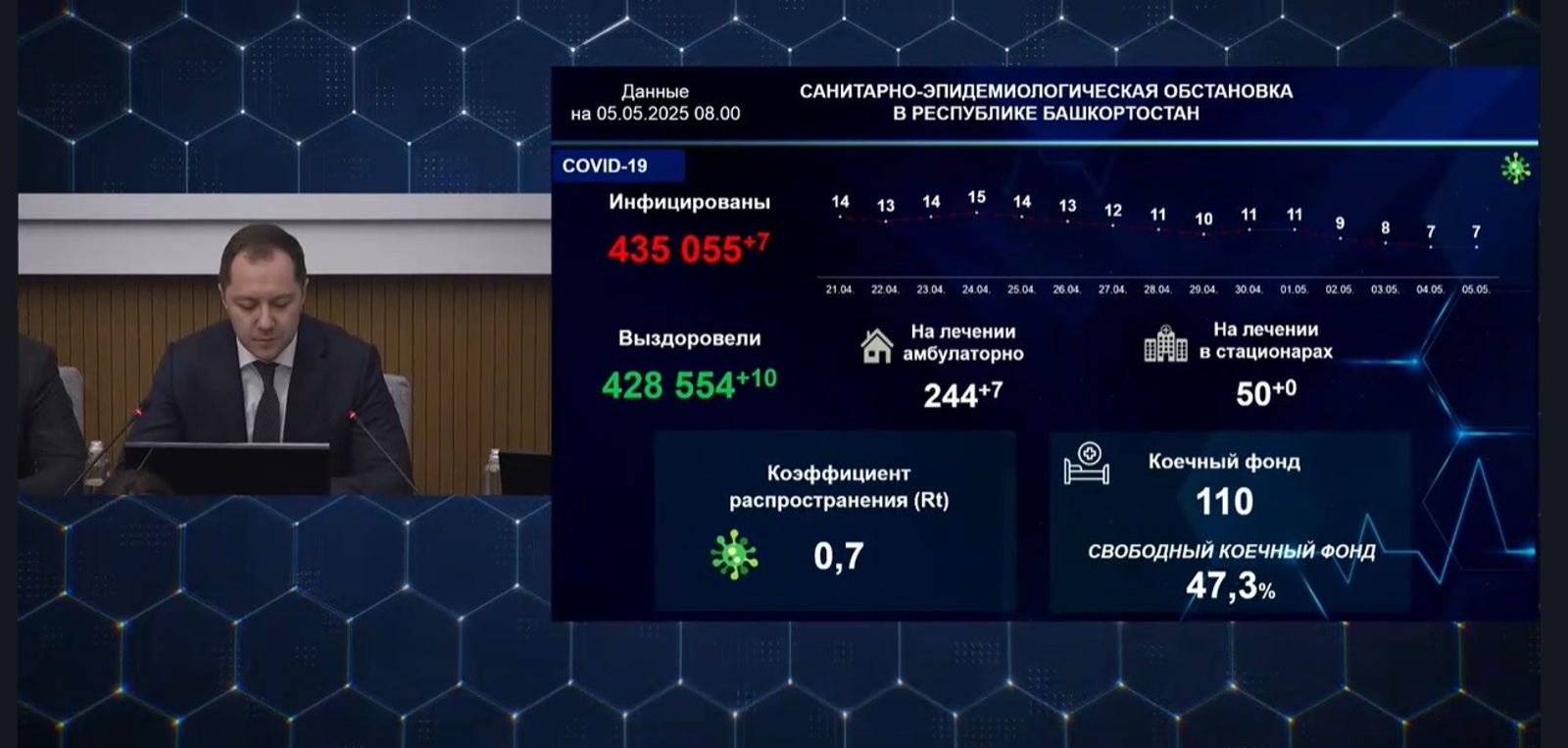 В Башкирии за последние сутки выявлено семь случаев новой коронавирусной инфекции. Об этом сегодня в ходе оперативного совещания правительства в ЦУРе сообщил министр здравоохранения республики Айрат Рахматуллин.