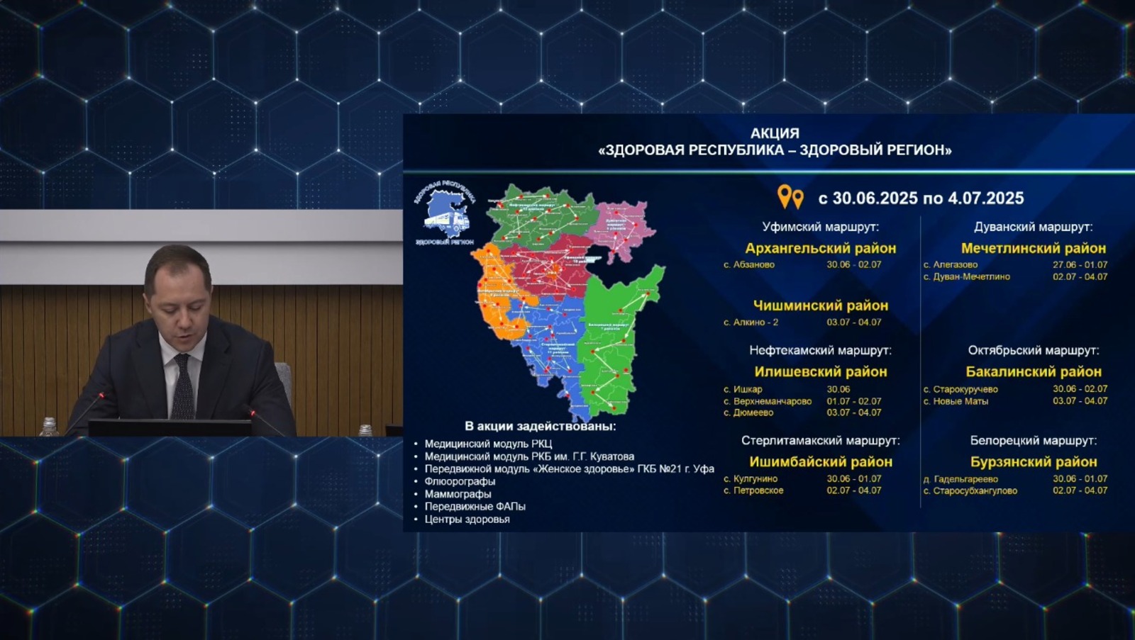 В своём докладе министр здравоохранения также рассказал о работе скорой медицинской помощи. По его словам, за прошедшую неделю в регионе было совершено 19 245 выездов, из которых 92,5% были выполнены в течение 20 минут с момента вызова.