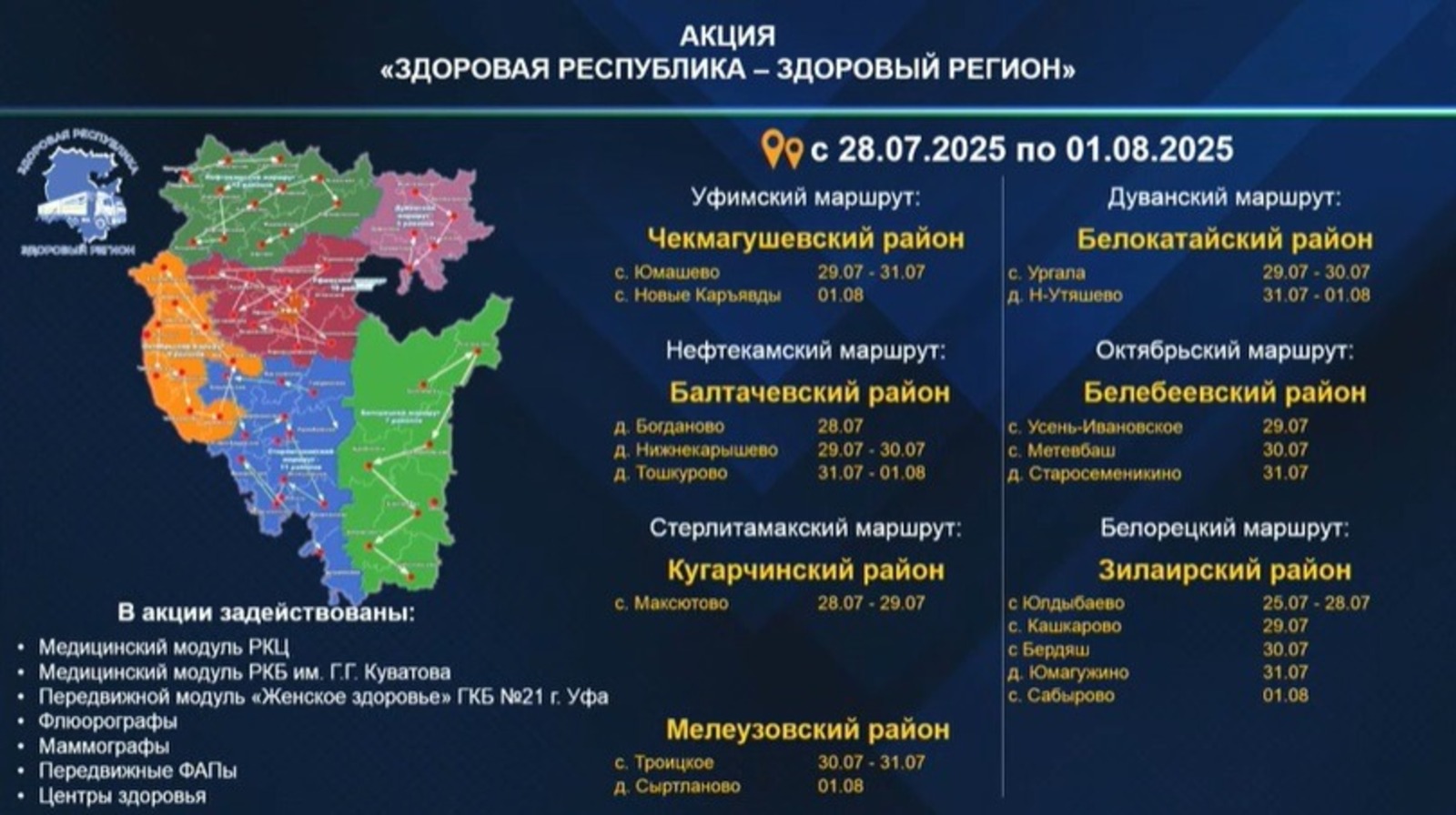 На этой неделе мобильные бригады медиков посетят жителей отдалённых населённых пунктов Чекмагушевского, Балтачевского, Кугарчинского, Мелеузовского, Белокатайского, Белебеевского и Зилаирского районов. Об этом на оперативном совещании правительства в ЦУРе сообщил первый заместитель министра здравоохранения республики Роберт Иштуков.