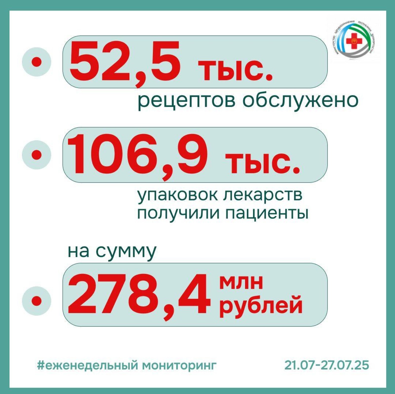 По его словам, за последнюю неделю июля 2025 года аптеки обслужили более 52,5 тысячи рецептов, было выдано 106,9 тысячи упаковок лекарств на общую сумму 278,4 млн рублей.