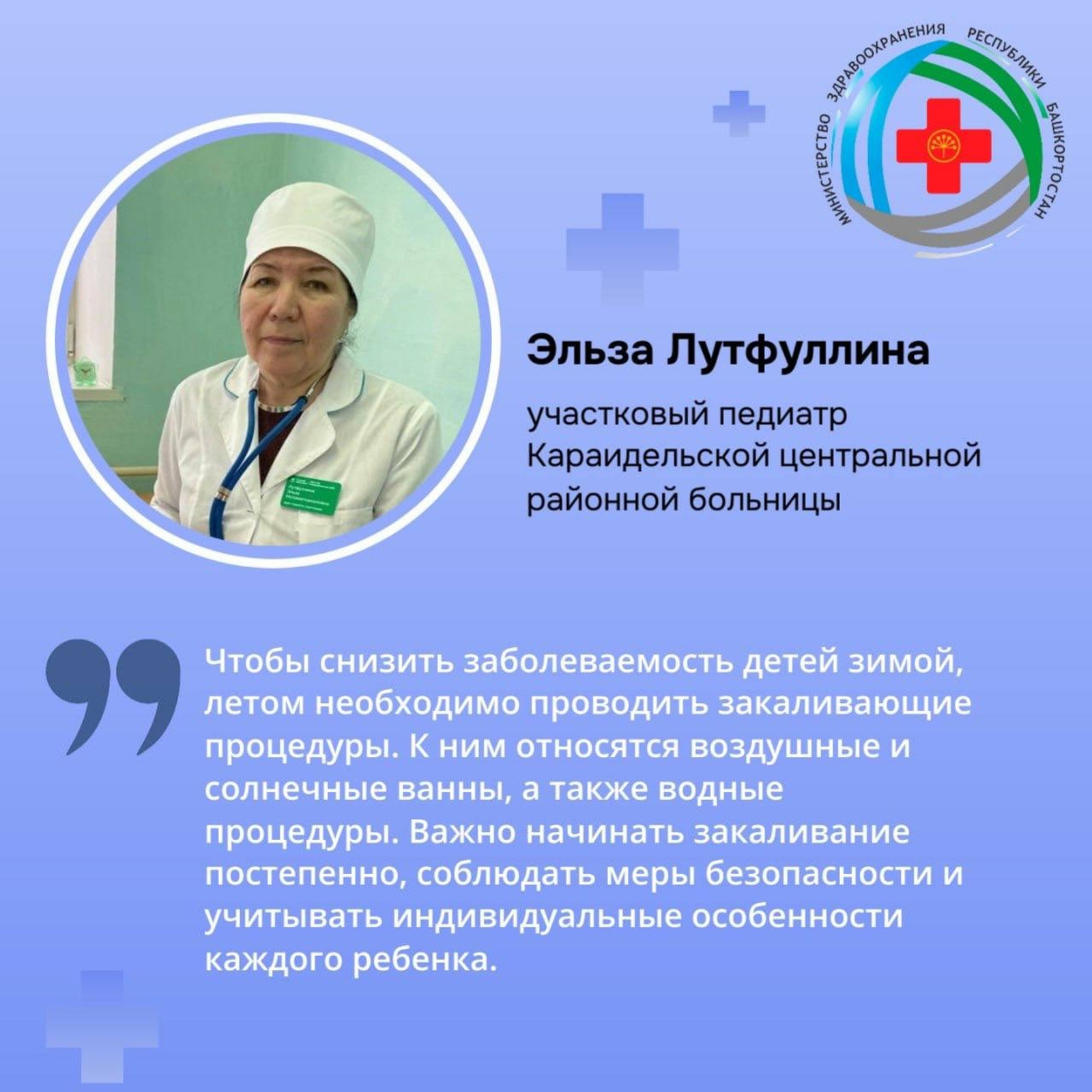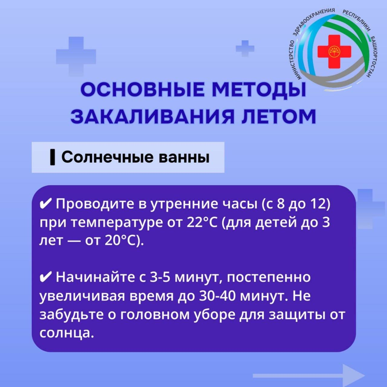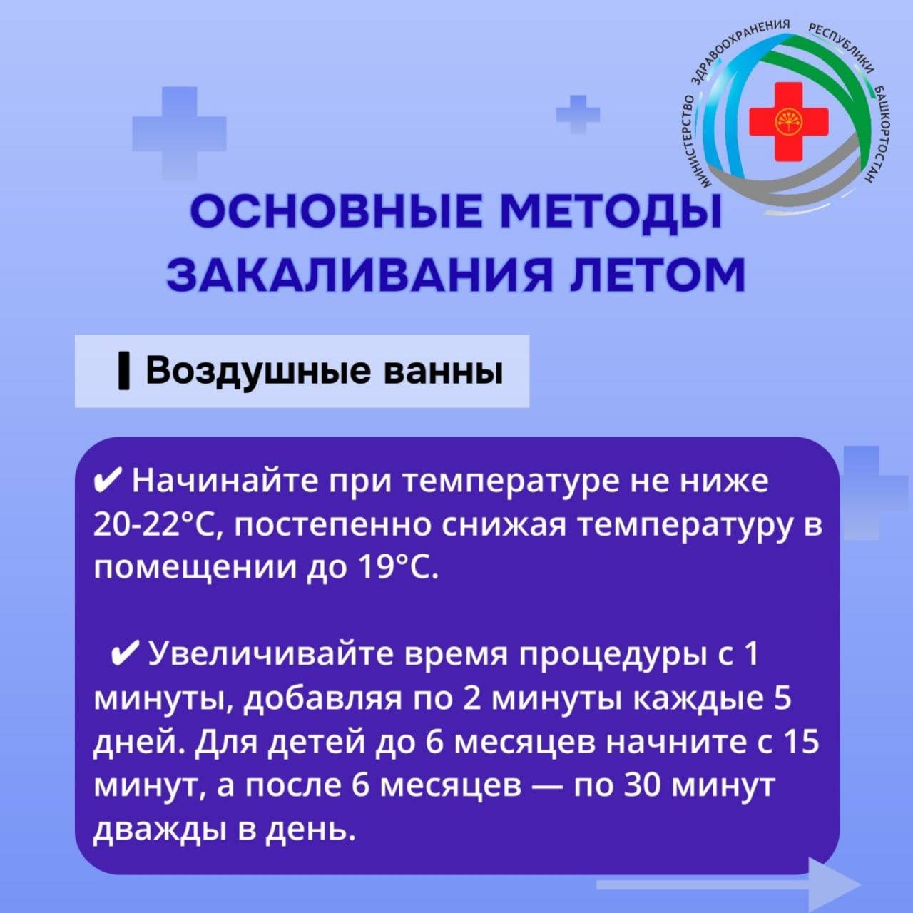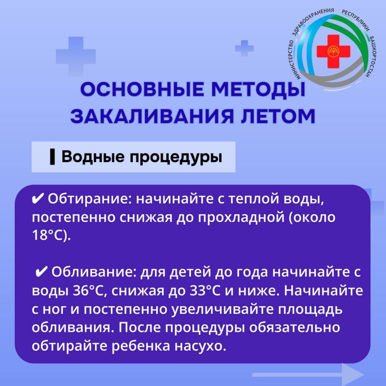 «К ним относятся воздушные и солнечные ванны, а также водные процедуры. Важно начинать закаливание постепенно, соблюдать меры безопасности и учитывать индивидуальные особенности каждого ребенка», – рассказала Эльза Лутфуллина.