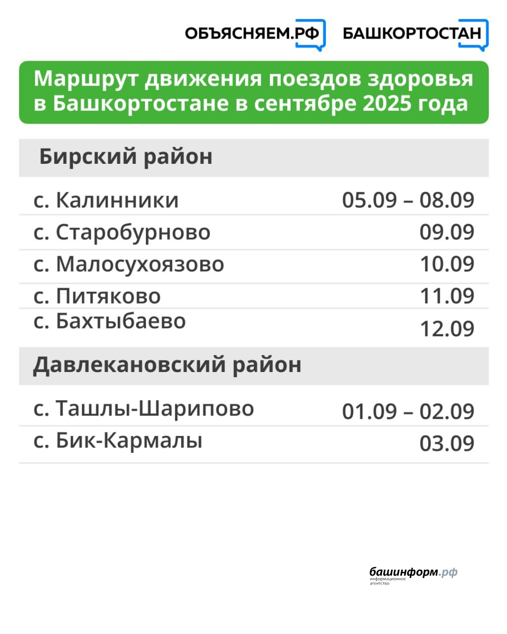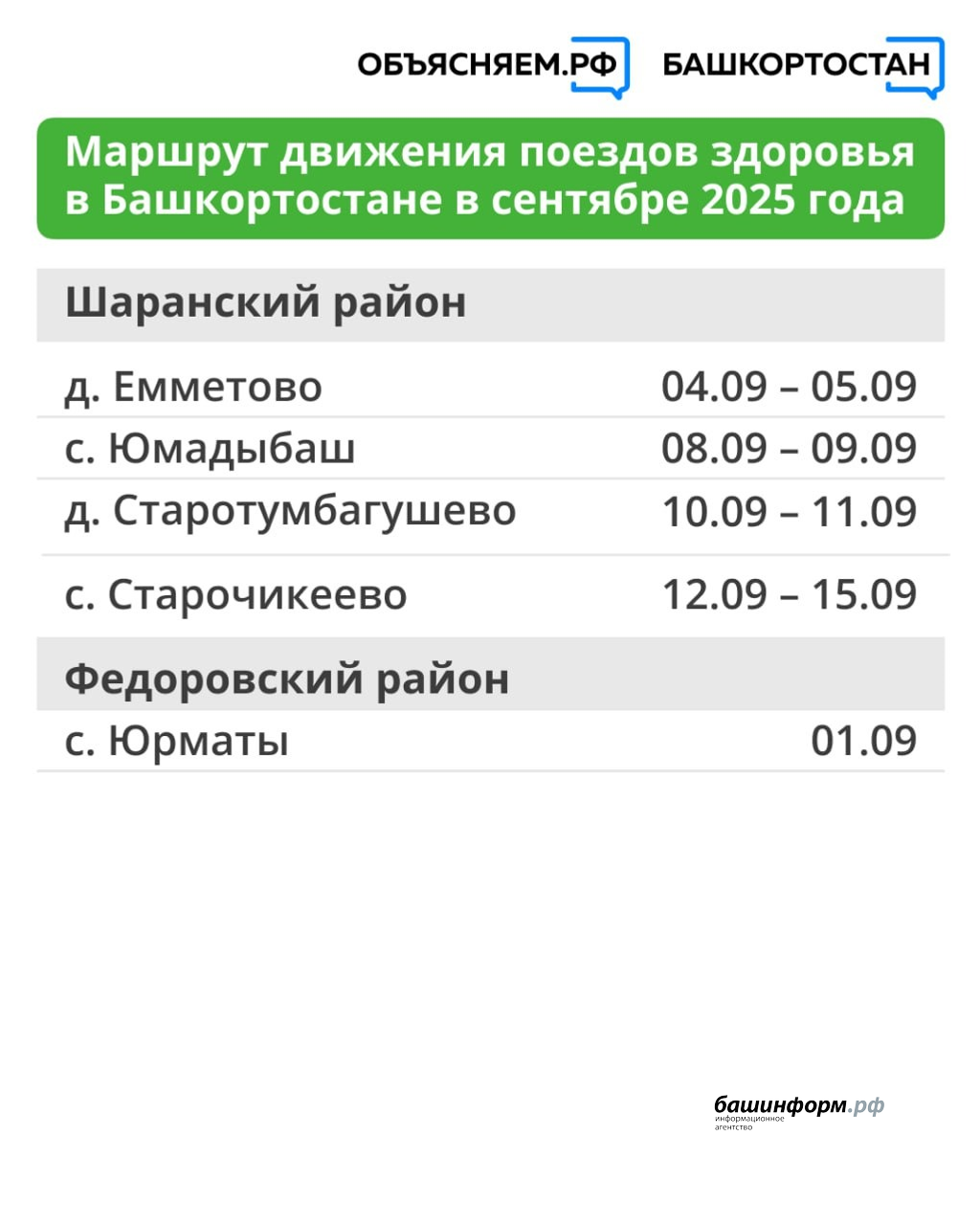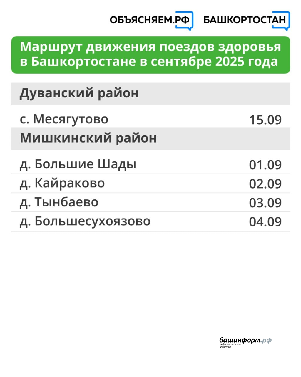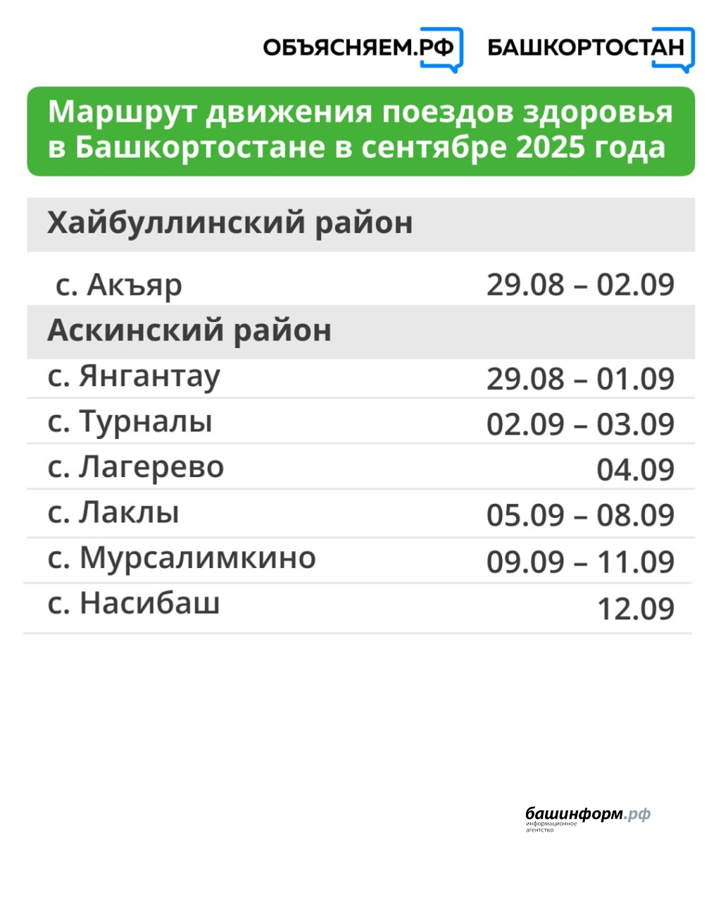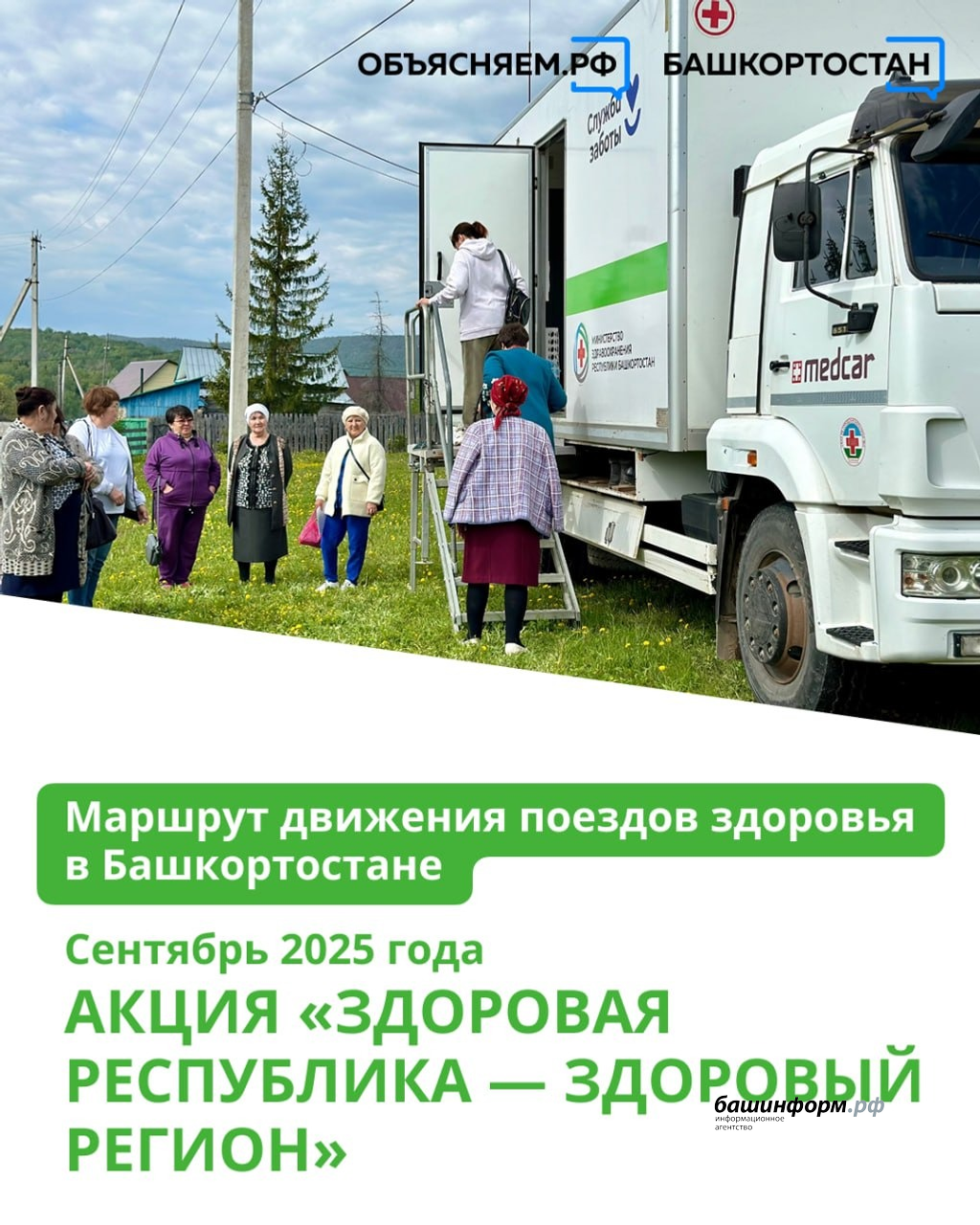 В сентябре 2025 года «поезда здоровья» приедут в Бирский, Давлекановский, Дуванский, Зианчуринский, Мишкинский, Салаватский, Уфимский, Федоровский, Хайбуллинский и Шаранский районы.