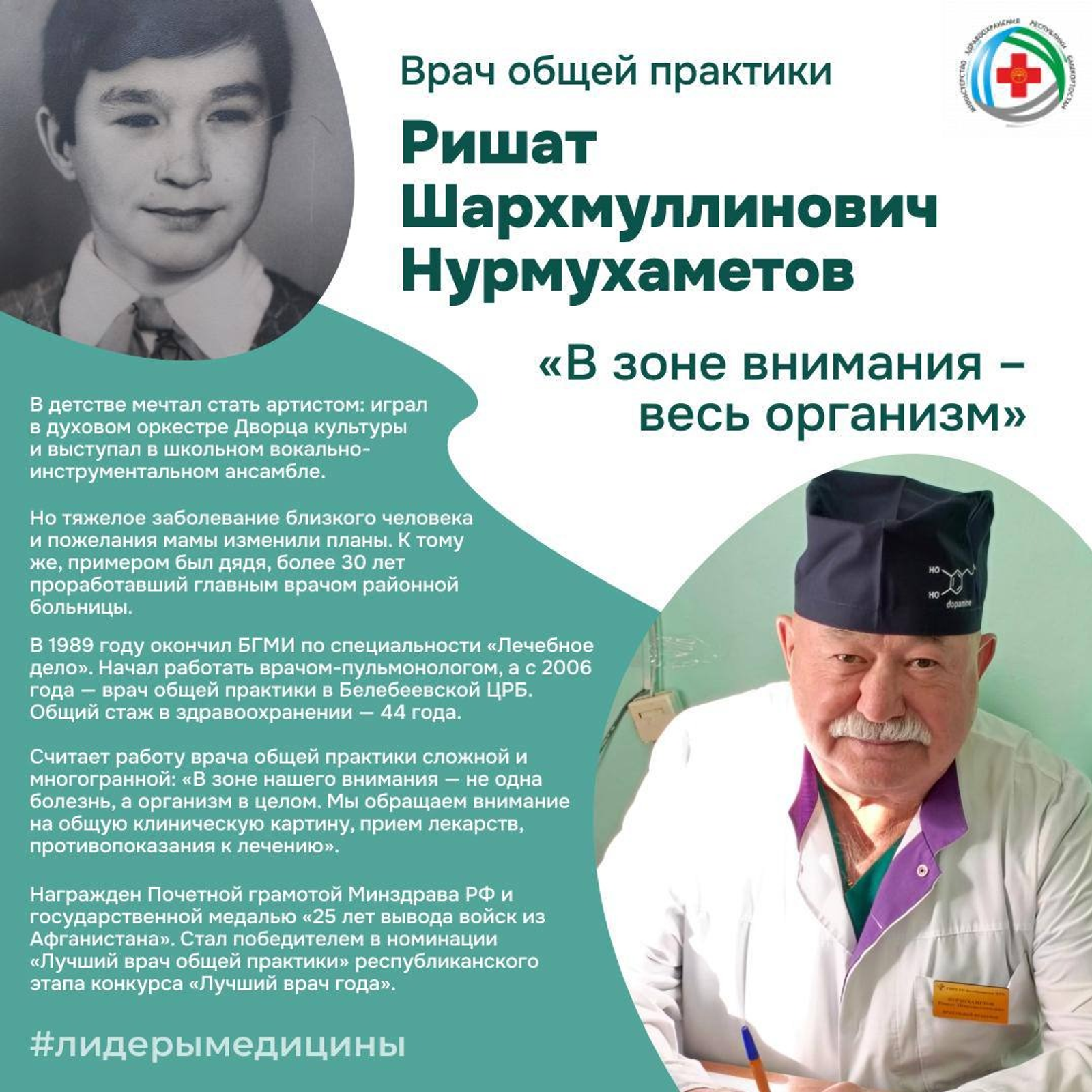 Как сообщил в соцсетях министр здравоохранения РБ Айрат Рахматуллин, в детстве Ришат Шархмуллинович любил петь, танцевать, читать стихи и мечтал стать артистом. Поступил в музыкальную школу по классу трубы, самостоятельно научился играть на гитаре. Творческая жизнь складывалась успешно. Он играл в духовом оркестре Дворца культуры и выступал в школьном вокально-инструментальном ансамбле. Но тяжелое заболевание близкого человека и пожелания его мамы, чтобы он стал врачом, серьезно изменили планы по выбору профессии. Наставником с первых дней учебы в медвузе для будущего доктора стал родной дядя, который более 30 лет проработал главврачом в одной из районных больниц.