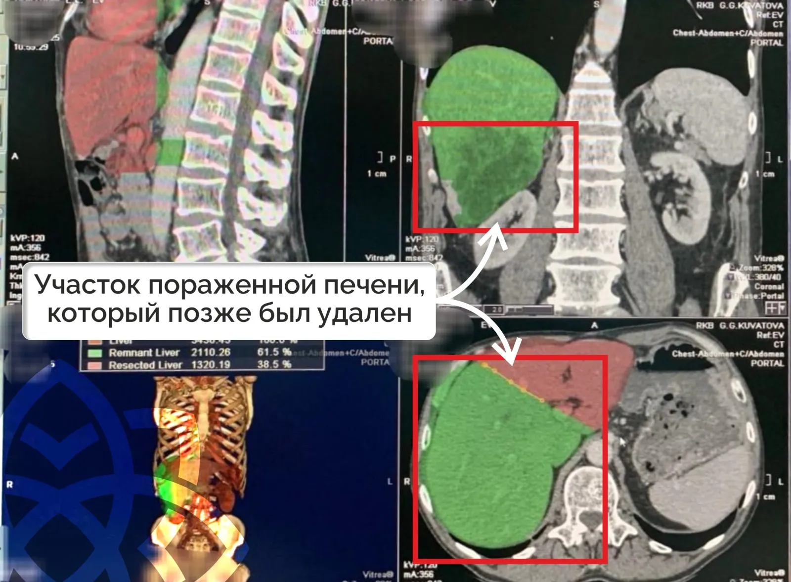 По данным минздрава республики, в 2023 году пациенту удалили кишечную опухоль. Послеоперационное восстановление протекало плохо, состояние пациента оставалось тяжелым. Поэтому химиотерапия была невозможна. В середине 2025 года в печени обнаружили огромную опухоль размером 95×115×87 мм.