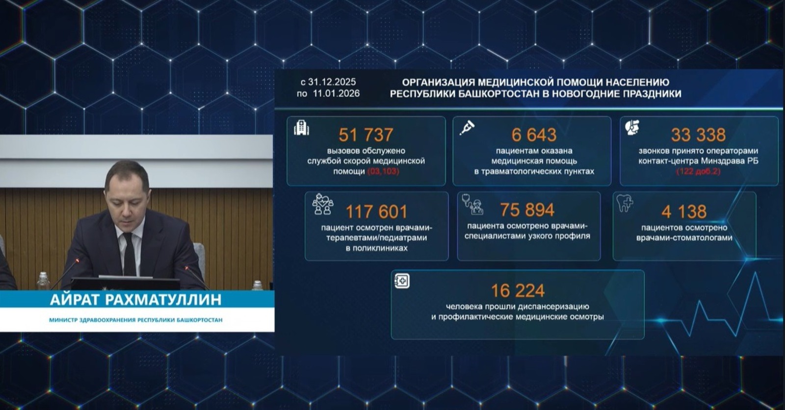 Амбулаторное лечение людей было организовано со 2 января. По словам Айрата Рахматуллина, за это время более 6 тысяч жителей обратились в травмпункты, более 51 тысячи вызвали скорую медпомощь. В поликлиниках врачи осмотрели более 117 тысяч пациентов, в том числе свыше 75 тысяч — специалисты узкого профиля и более 4 тысяч — стоматологи. Кроме того, более 16 тысяч пациентов прошли диспансеризацию и медосмотры.