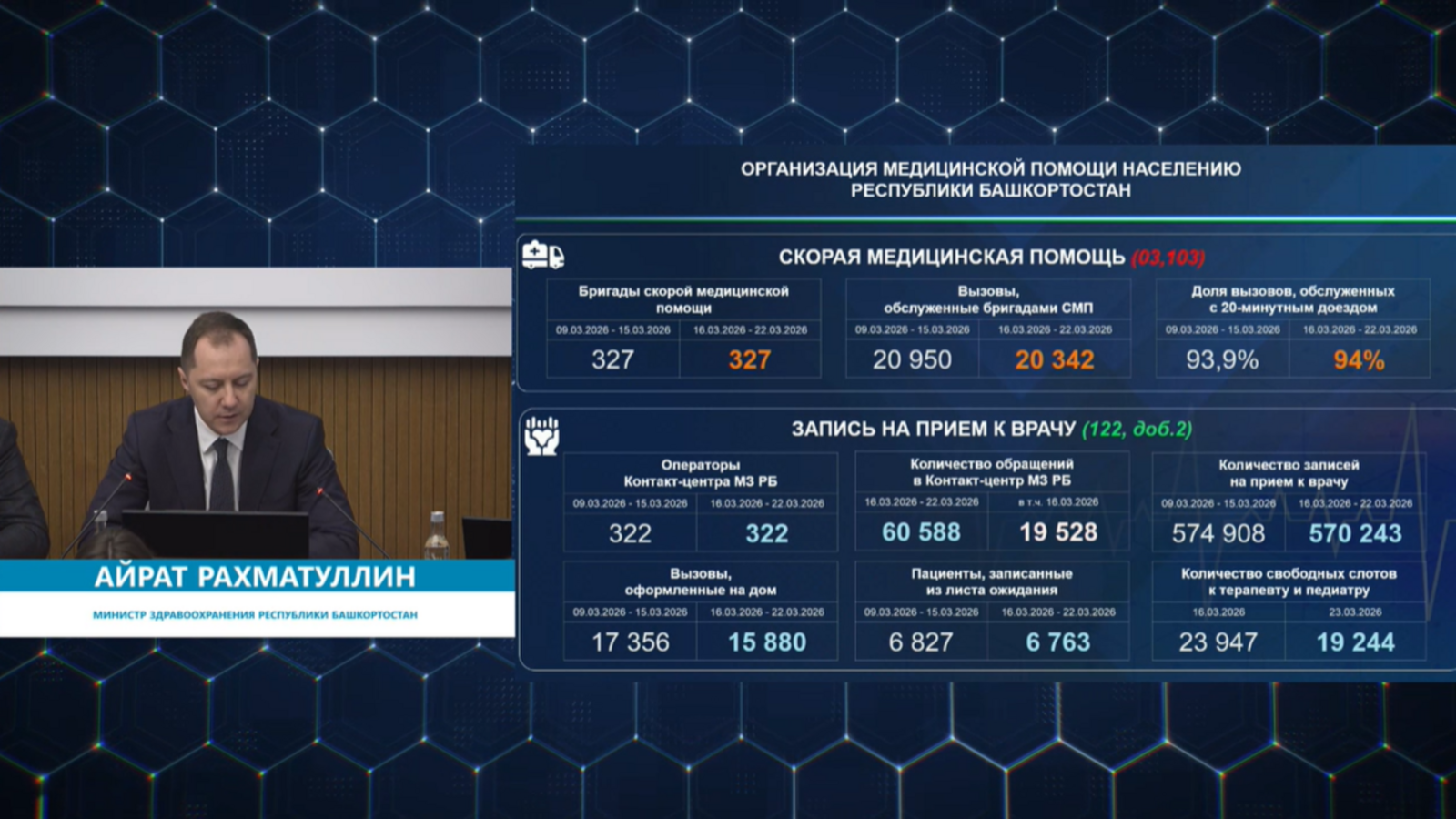 В Башкирии на прошлой неделе скорая медицинская помощь обслужила 20 950 вызовов. 94% из них — с 20-минутным доездом, на прошлой неделе эта цифра составила — 93,9%. Об этом на оперативном совещании правительства в ЦУРе доложил министр здравоохранения республики Айрат Рахматуллин.