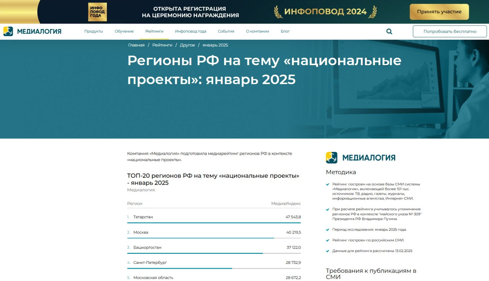 Компания «Медиалогия» подготовила медиарейтинг регионов РФ в контексте «национальные проекты». В тройку регионов-лидеров страны на тему «национальные проекты» также вошли Москва и Татарстан.