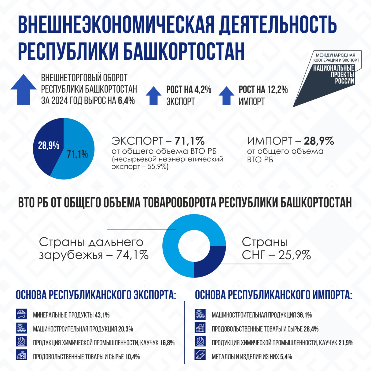 Башкирия развивает внешнеэкономические связи со 103 странами. В первой десятке: Китай, Турция, Индия, Казахстан, Тунис, Узбекистан, Киргизия, Беларусь, Бразилия и Ливия. В прошлом году на них пришлось около 75% внешнеторгового оборота республики. Растет внешнеторговый оборот со странами бывшего СССР, ШОС и БРИКС. Этому помогает сеть представительств Башкирии в зарубежных странах. Сейчас они работают в Беларуси, Казахстане, Узбекистане, Турции и Китае, ОАЭ.
