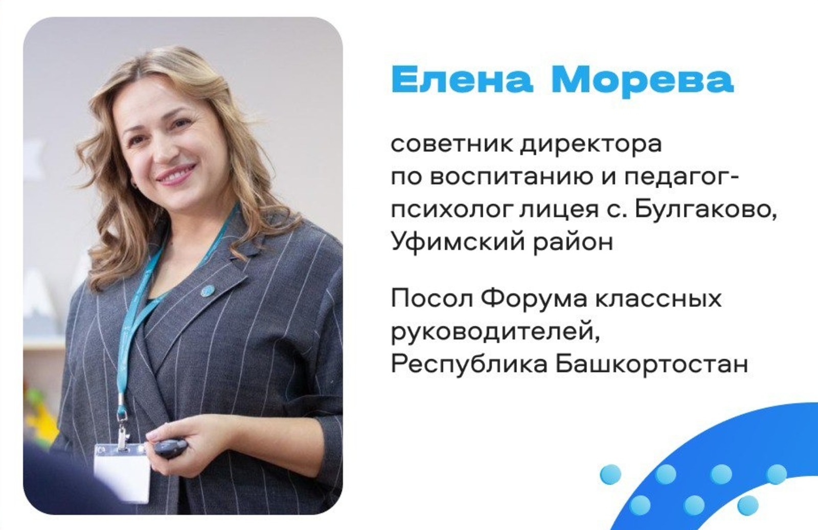 Новым послом Форума классных руководителей в Башкирии стала Елена Морева, советник директора по воспитанию лицея села Булгаково Уфимского района. Об этом сообщили в региональном минобразования.