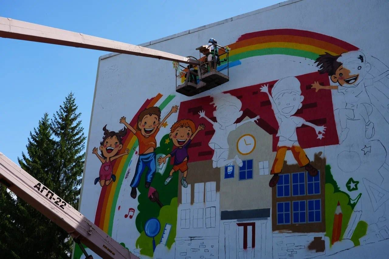 Школа № 4 Салавата запомнилась ярким муралом на фасаде. Внутри — новые окна, современные коммуникации, завершается монтаж противопожарных дверей.