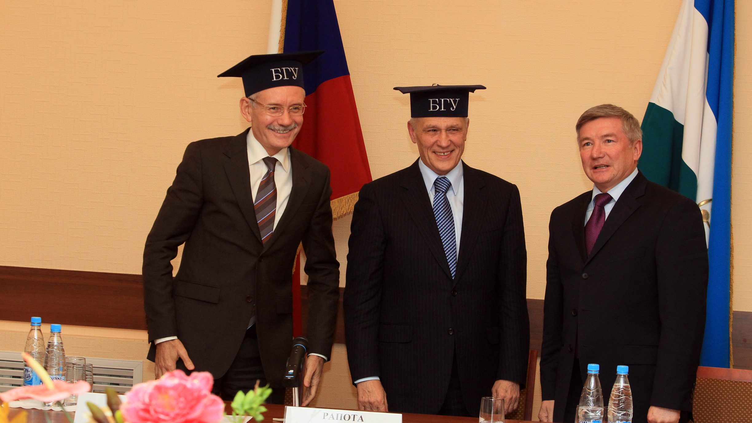 На память о встрече ректор БГУ Ахат Мустафин подарил гостям университетские конфедератки.