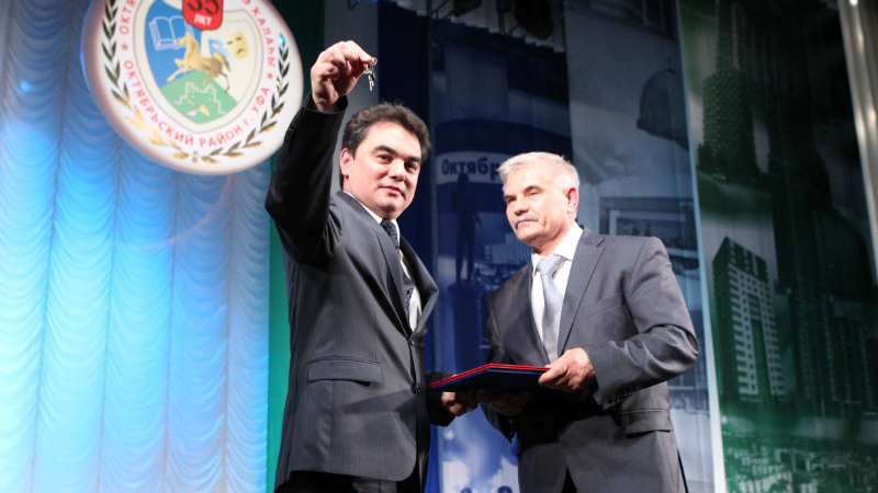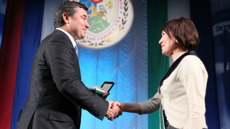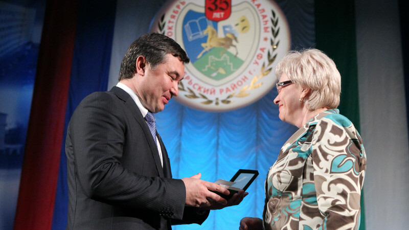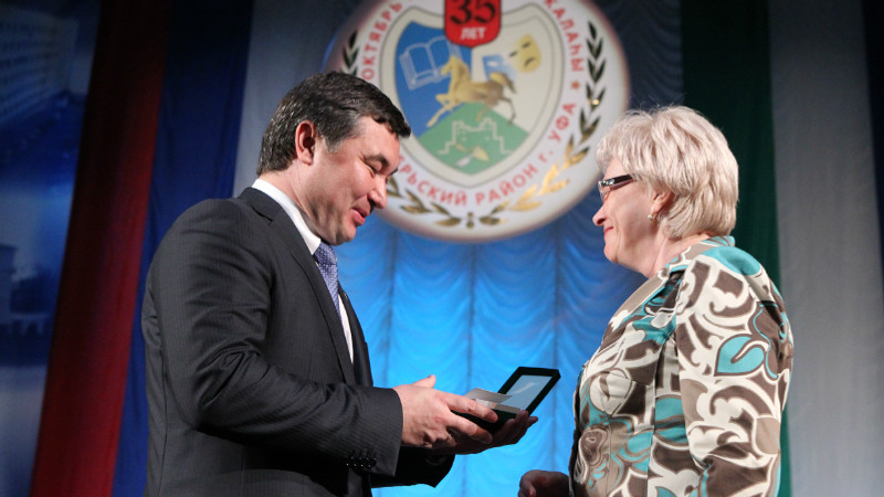 Азамат Илимбетов зачитал приветствие Президента республики Рустэма Хамитова, в котором Октябрьский район назван самым молодым и динамичным районом столицы. В приветствии главы республики выражаются слова благодарности труженикам района, а также уверенность в том, что их добрые традиции будут продолжены новыми поколениями, новыми трудовыми династиями. Премьер-министр вручил награды - Почетные грамоты Республики Башкортостан и дипломы о присвоении званий заслуженных работников - труженикам разных сфер.