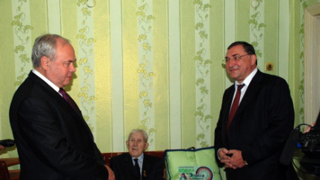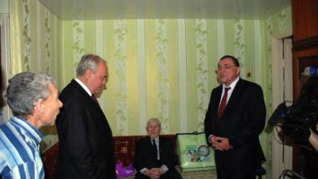 В Башкортостане в рамках реализации Указа Президента России начали персонально поздравлять ветеранов войны и тружеников тыла, достигших 90-летнего возраста и выше. Согласно Указу, личные поздравления от имени Президента России долгожителям должны вручаться представителями высшего должностного лица региона и главными федеральными инспекторами в субъектах РФ. Одним из первых подарки от руководства страны и республики получил Михаил Давыдович Соломонов. На днях ему исполнилось 100 лет. Юбиляра поздравили Председатель Государственного Собрания - Курултая РБ Константин Толкачев и Главный федеральный инспектор по Республике Башкортостан Петр Капишников.