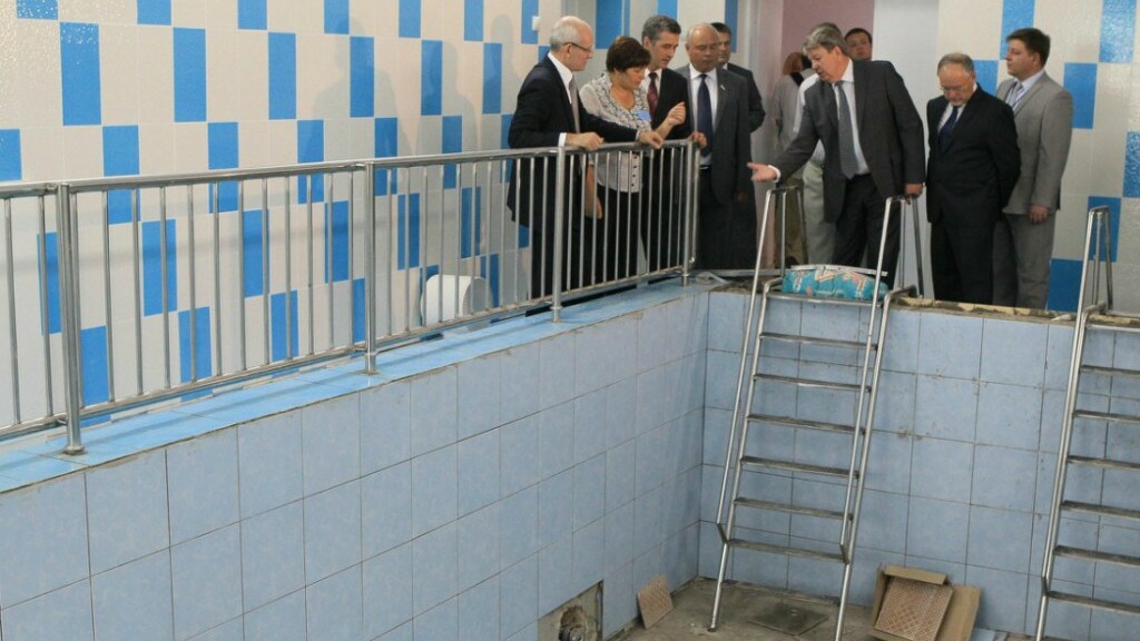 Рустэм Хамитов указал на недоработки при проектировании бассейна. Он построен несоразмерно глубоким, а вода будет наполняться в нем до отметки 70. В результате, детям придется подниматься и спускаться по высокой лестнице. И здесь в первую очередь, нагрузка ляжет на воспитателей, которые будут буквально на руках носить детей.