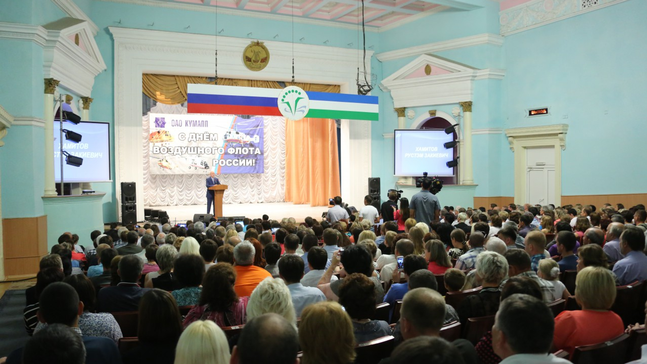 В городском центре «Дуслык» Рустэм Хамитов принял участие в торжественном собрании, посвященном Дню Воздушного Флота России. Руководитель республики поздравил работников и ветеранов авиастроительной отрасли с профессиональным праздником и вручил государственные награды Башкортостана.