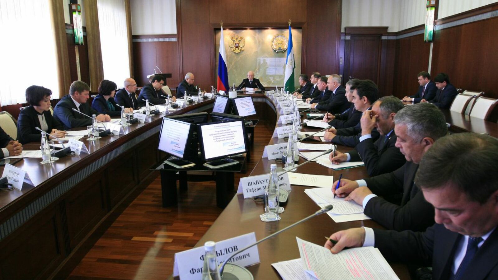 УФА, 5 окт 2015. /ИА «Башинформ», Александр Смирнов/. 5 октября в Доме Республики Глава Башкортостана Рустэм Хамитов провел заседание постоянно действующего координационного совещания по обеспечению правопорядка в регионе, посвященное предупреждению правонарушений, совершаемых в отношении детей. В нем приняли участие члены Правительства РБ, руководители профильных министерств и ведомств, главы муниципалитетов.