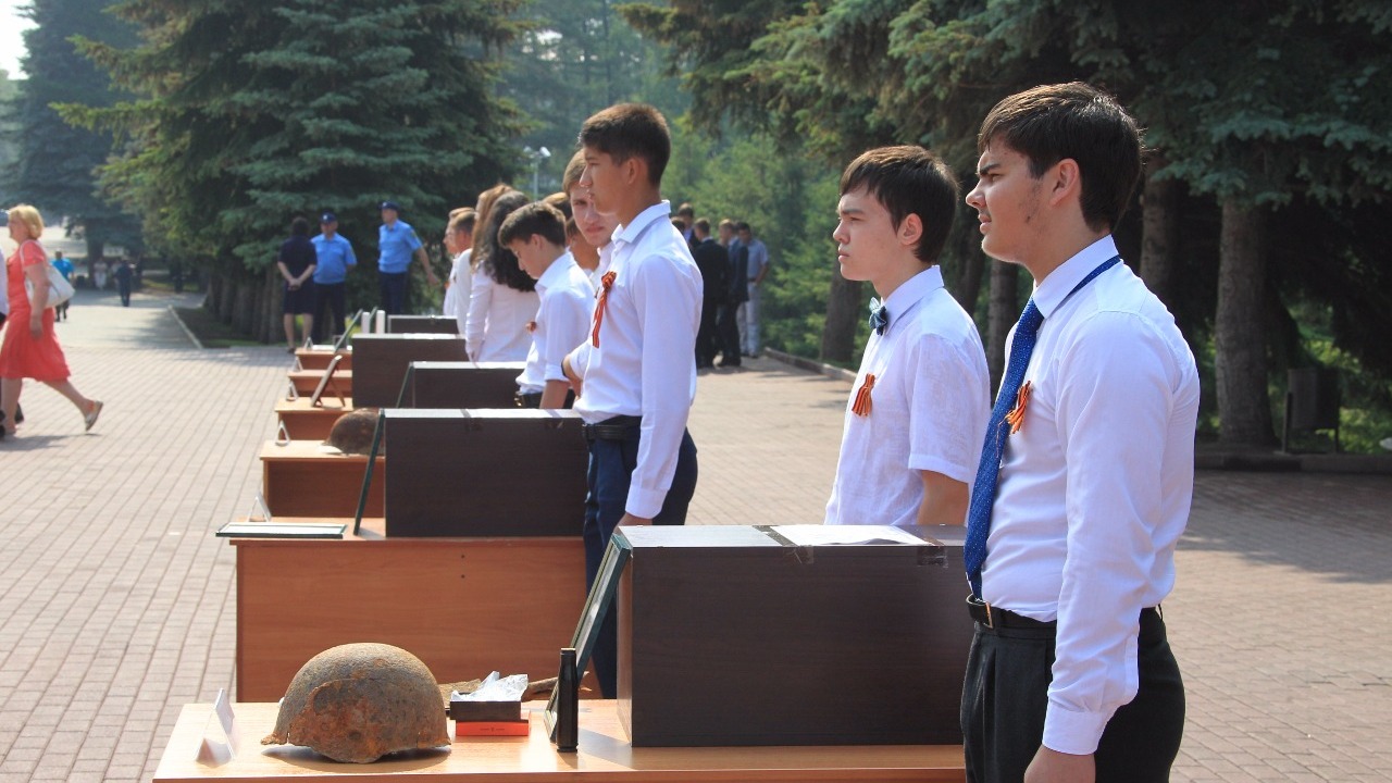 После возложения цветов к мемориалу «Вечный огонь» в парке Победы состоялась передача родственникам останков красноармейцев и именных личных вещей, найденных поисковыми отрядами в ходе «Вахт Памяти».