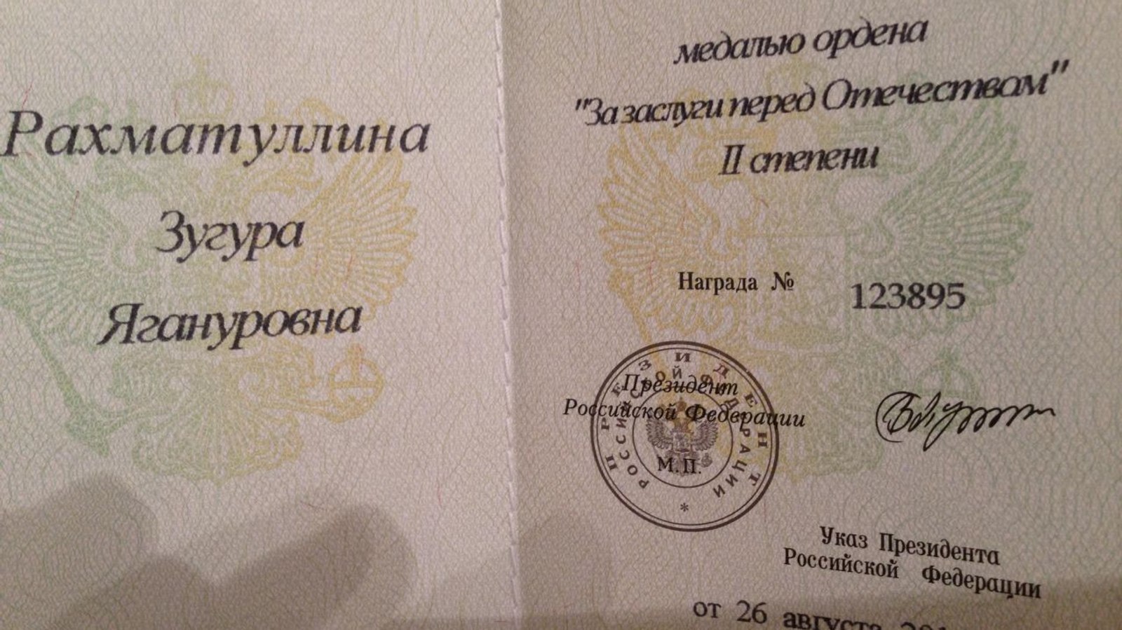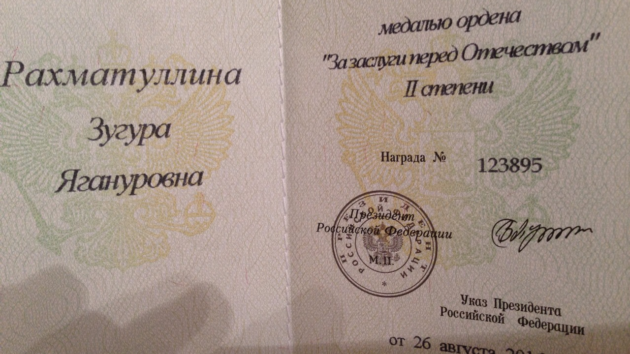 УФА, 5 окт 2016. /ИА «Башинформ», Галия Набиева/. Депутат Госдумы седьмого созыва Зугура Рахматуллина награждена медалью ордена «За заслуги перед Отечеством» II степени. Торжественная церемония состоялась накануне. Указ о награждении Президент РФ Владимир Путин подписал 26 августа.