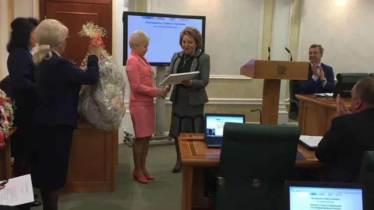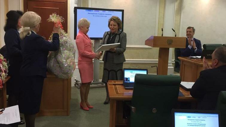 УФА, 28 ноя 2016. /ИА «Башинформ», Арина Рахимкулова/. В понедельник, 28 ноября, депутат Госдумы от Башкирии Рима Баталова получила подарок из рук Председателя Совета Федерации Валентины Матвиенко. Парламентарию вручена Благодарность за активную благотворительную деятельность и большой вклад в формирование социально-экономических программ, направленных на реализацию решений Евразийского женского форума.