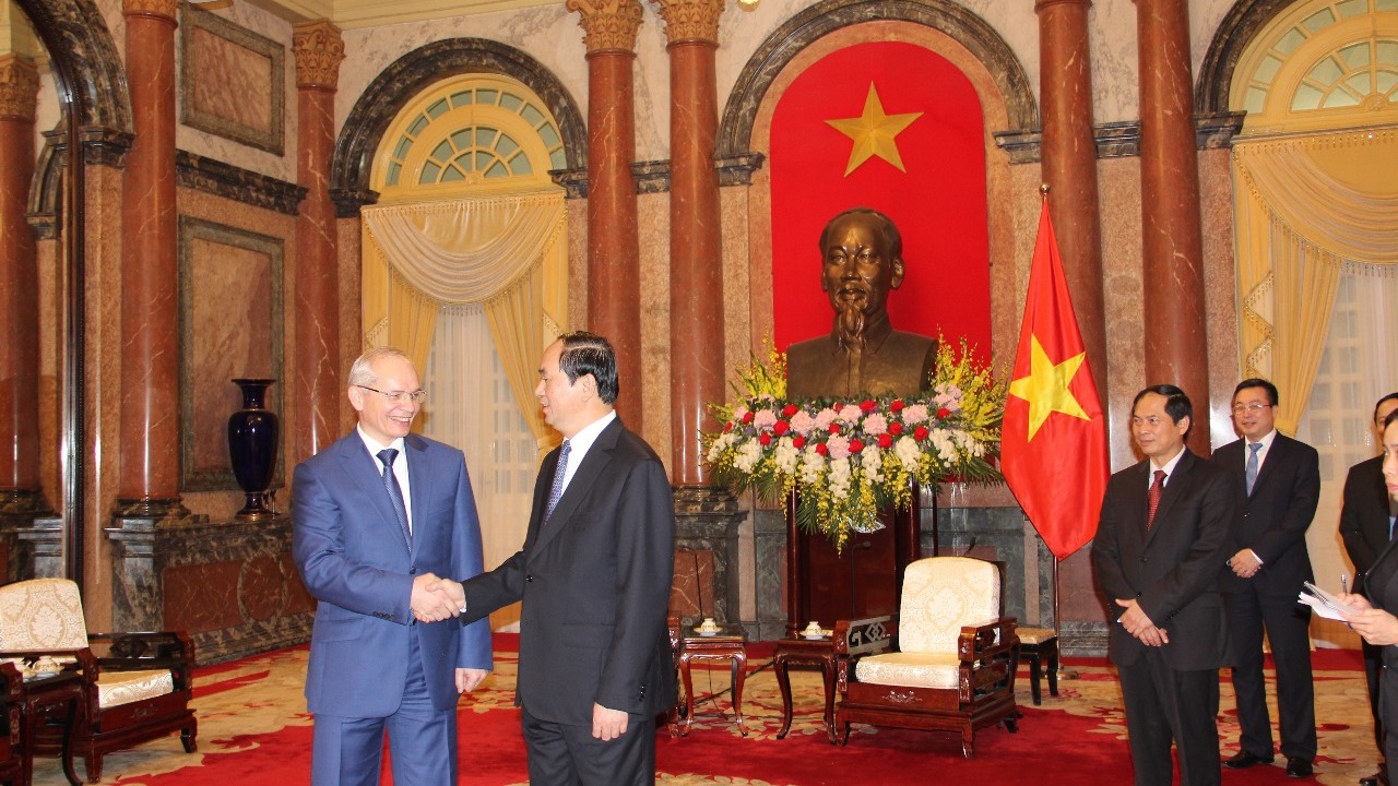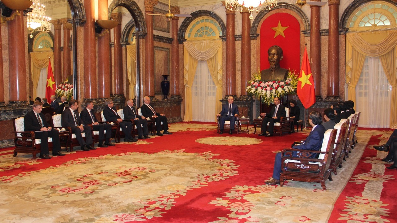 УФА, 11 янв 2017. /ИА «Башинформ», Сергей Захаров/. Делегацию республики, которая во главе с Премьер-министром Правительства Башкортостана Рустэмом Мардановым находится с официальным визитом в Социалистической Республике Вьетнам, принял Президент этой страны Чан Дай Куанг. Встреча состоялась в Ханое в президентском дворце.