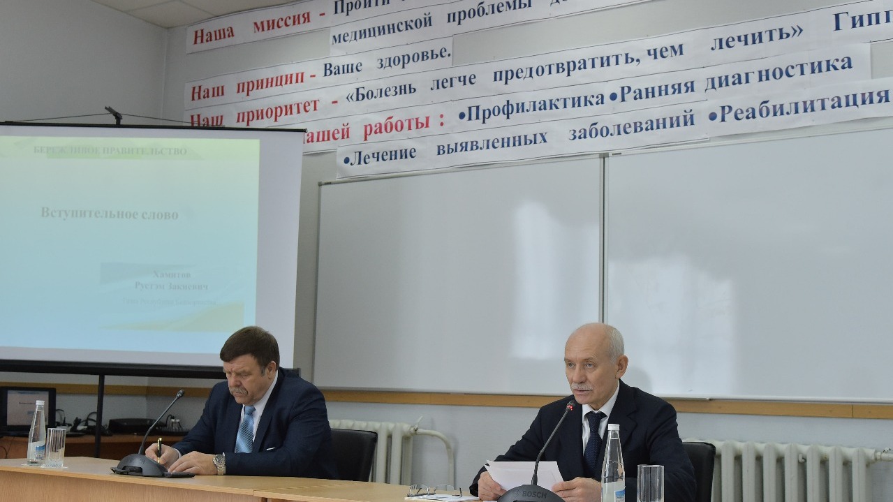 УФА, 29 мар 2018. /ИА «Башинформ»/. Сегодня в уфимской поликлинике № 32 Глава Башкортостана Рустэм Хамитов провёл совещание, посвящённое промежуточным итогам реализации проекта «Бережливое правительство» в министерствах республики.