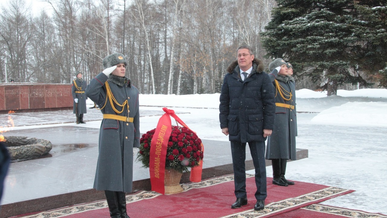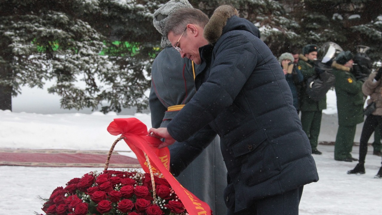 УФА, 23 фев 2019. /ИА «Башинформ», Азат Гиззатуллин/. Врио главы Башкортостана Радий Хабиров в День защитника Отечества в уфимском парке Победы возложил цветы к Вечному огню у памятника Героям Советского Союза Александру Матросову и Минигали Губайдуллину.