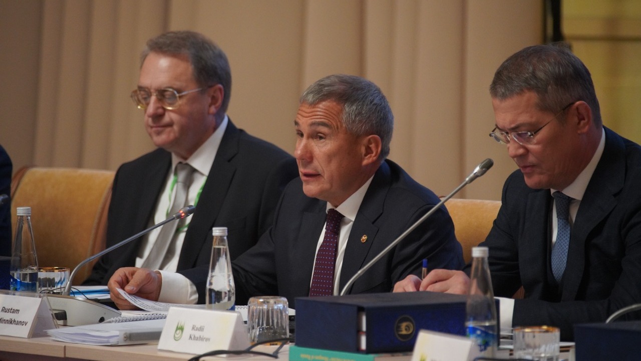 Президент Татарстана поблагодарил Радия Хабирова за приглашение провести заседание форума «Россия – исламский мир» в Уфе и отметил, что Башкортостан показывает пример межнациональной и межконфессиональной дружбы.