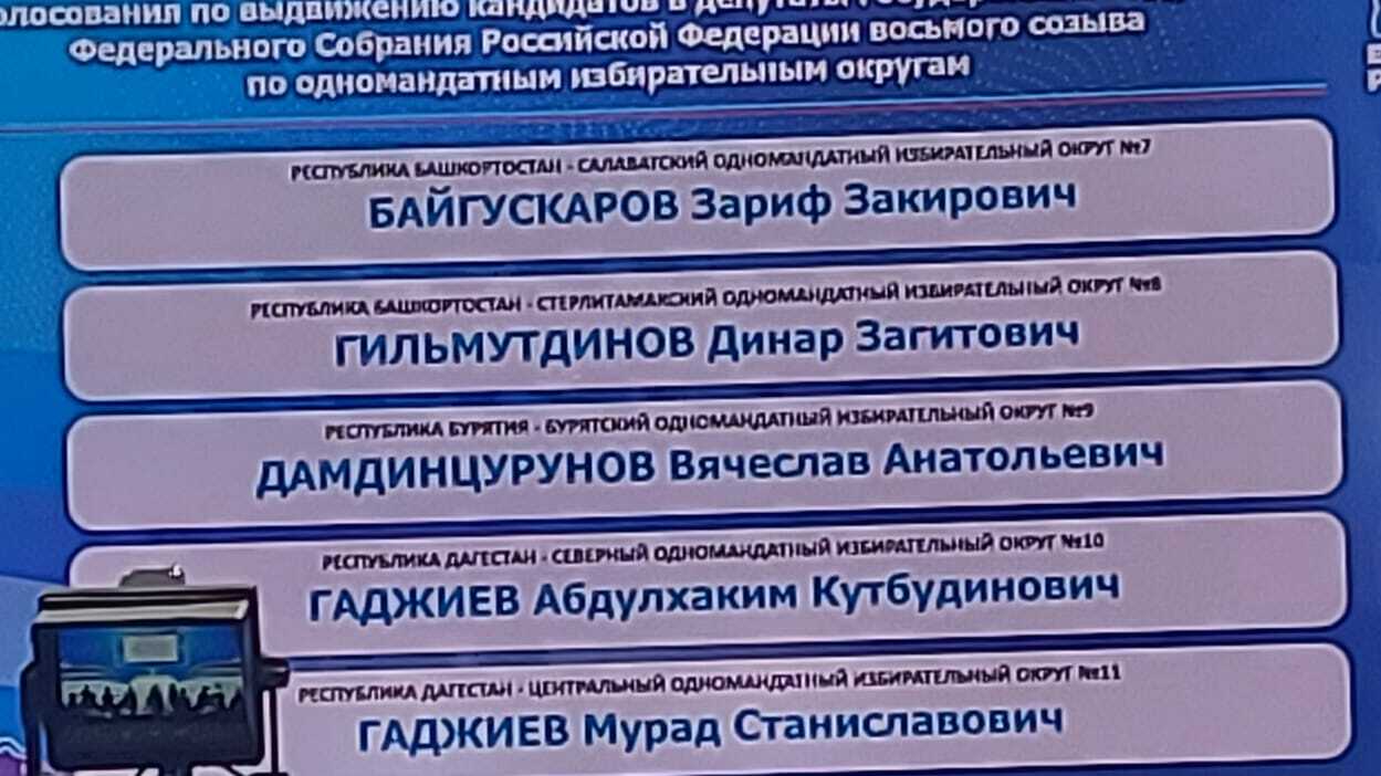 По Уфимскому одномандатному избирательному округу партию будет представлять депутат Госдумы Павел Качкаев, в Благовещенском избирательном округе — депутат Госдумы Рафаэль Марданшин, Белорецком — заместитель председателя Госсобрания Башкортостана Эльвира Аиткулова, Нефтекамском — волонтер Раиль Адиятуллин, Салаватском — депутат Госдумы Зариф Байгускаров, Стерлитамакском — экс-начальник управления ГИБДД МВД по РБ Динар Гильмутдинов.