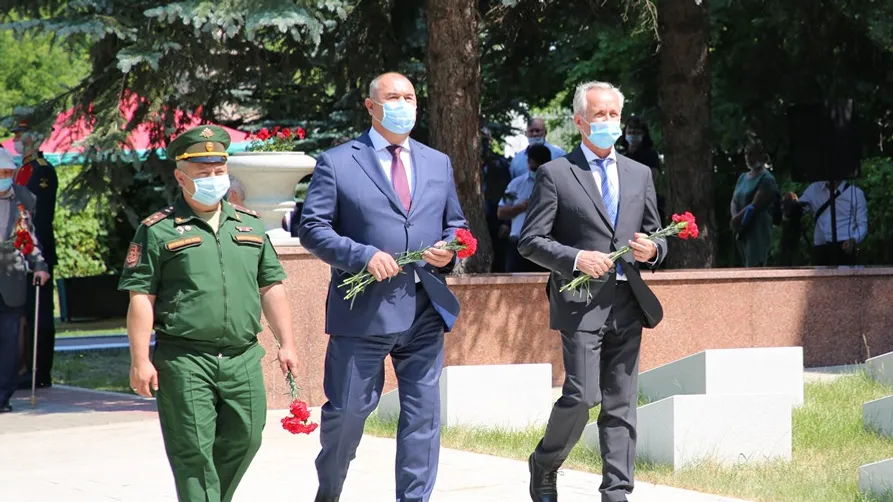 От имени многонационального народа Башкортостана Алексей Касьянов и Константин Толкачев возложили цветы к мемориалу «Солдат» и братским могилам погибших воинов. Участники церемонии почтили минутой молчания память не вернувшихся с фронта.
