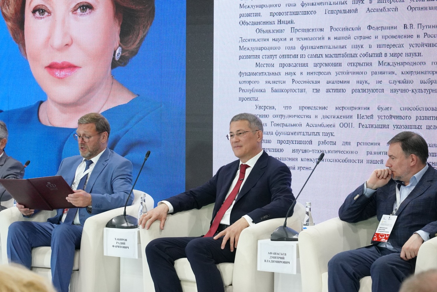 Заместитель Председателя Совета Федерации России Константин Косачёв зачитал приветствие спикера верхней палаты российского парламента Валентины Матвиенко. «Объявление Президентом страны Владимиром Владимировичем Путиным Десятилетия науки и технологий в нашей стране и открытие Международного года фундаментальных наук – масштабные события в мире науки, – отмечается в приветствии. – Не случайно и место открытия Международного года фундаментальных наук. В Башкортостане активно реализуют научные проекты. Проведение пленарной сессии «Евразийский вектор международного научно-технологического сотрудничества «Разворот на Восток» будет способствовать укреплению научной мысли в стране, модернизации российской экономики».