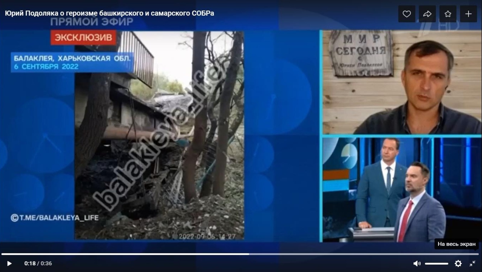 Его комментарий сопровождает фрагмент передачи, где блогер-военкор Юрий Подоляка рассказывает с места событий.