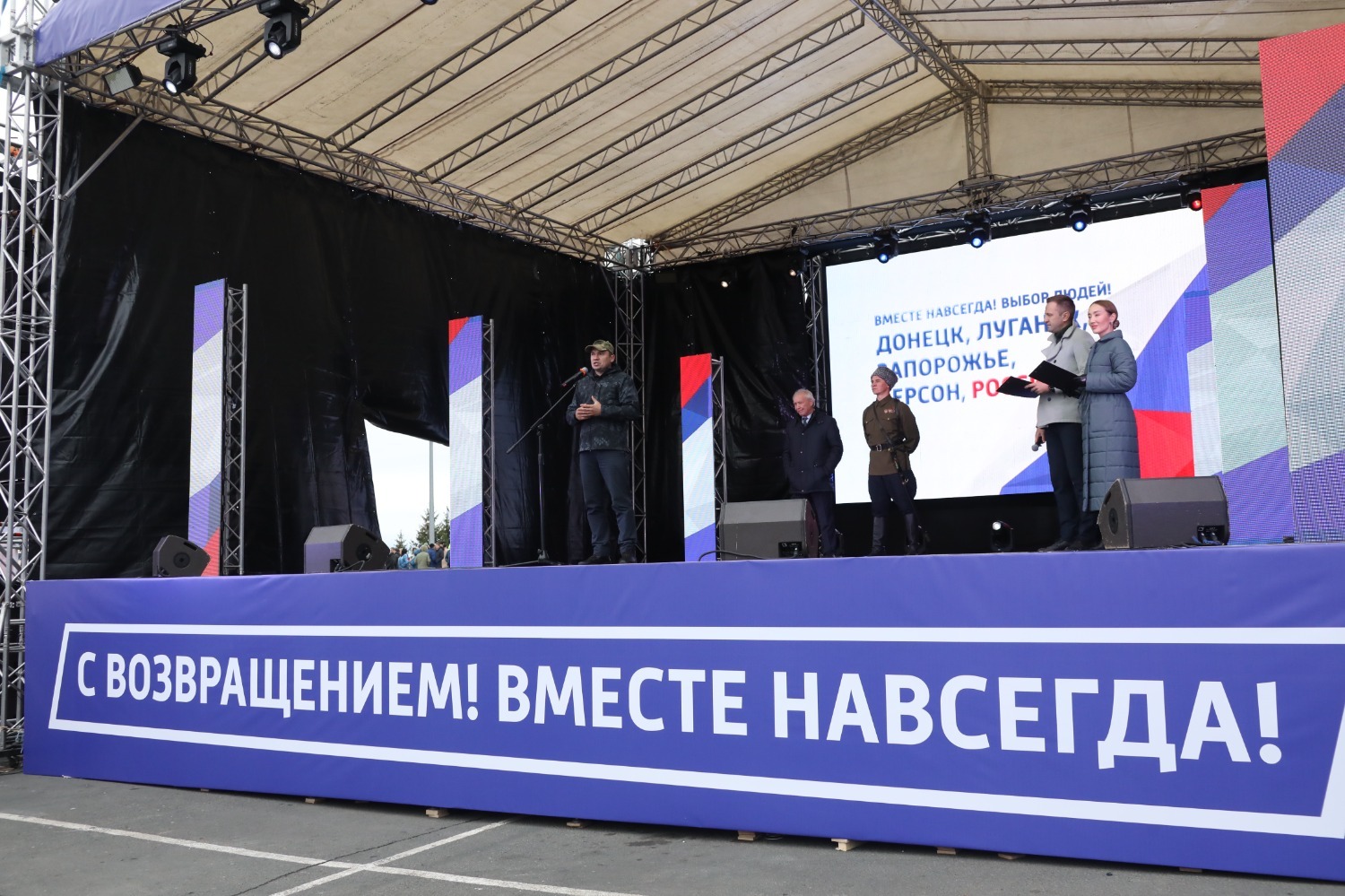 «Сегодняшнее мероприятие посвящено окончанию проведения референдума в ДНР, ЛНР и Запорожской и Херсонской областях. Подведены итоги, ближе к вечеру, мы надеемся, Владимир Путин подпишет заявки о вступлении в состав Российской Федерации данных республик. Добро пожаловать домой! Россия, вперед! Ребятам, которые сейчас находятся в зоне спецоперации, и тем, которые туда пойдут, хочется пожелать бодрости духа, здоровья и, самое главное, вернуться к своим семьям живыми и здоровыми», — сказал Валерий Черный.