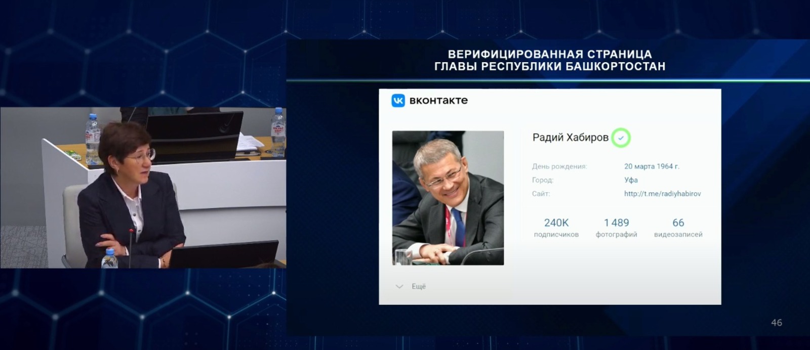 «Хочу обратить внимание на то, что увеличилось количество фейковой, недостоверной информации в социальных сетях. Если позволите, мы напомним, что официальные страницы чиновников — глав районов, министров, председателей госкомитетов, министерские страницы, ваша, Радий Фаритович, и страница Андрея Назарова — верифицированы, с галочкой. Галочка подтверждает, что именно эта страничка официальная. Страницы-клоны не являются площадками, которым можно верить», — отметила Елена Прочаковская.