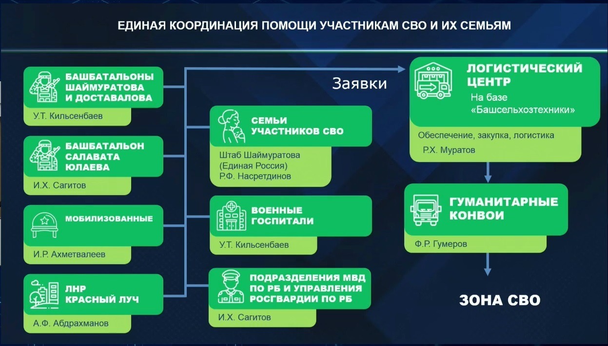 Руководитель администрации Главы РБ Максим Забелин доложил, что гумконвои доставляются бойцам башкирских добровольческих батальонов, мобилизованным жителям республики, а также в военные госпитали в рамках шефской помощи.