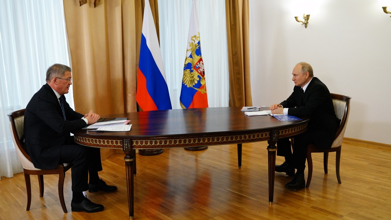 Президент России Владимир Путин, который сегодня прибыл в Уфу попрощаться с Муртазой Рахимовым, побеседовал с Главой Республики Башкортостан Радием Хабировым.