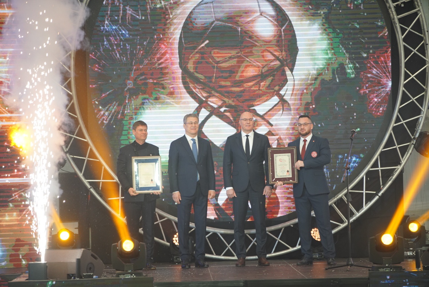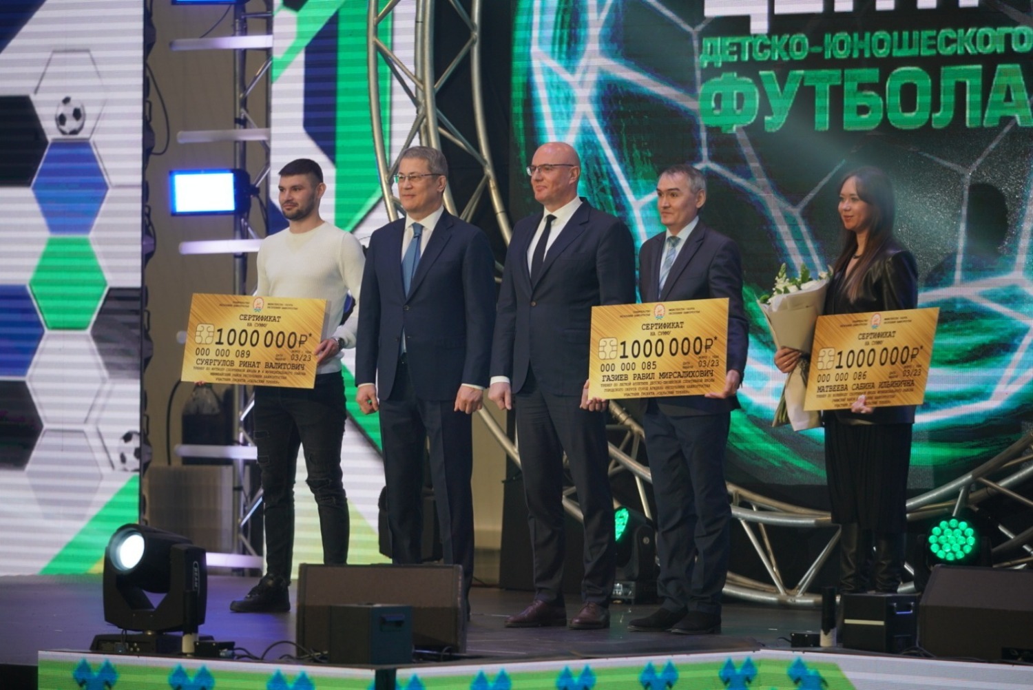 Заместитель председателя правительства вручил детско-юношеским командам Уфы сертификат на новую футбольную экипировку. Также вместе с Главой республики он наградил трех лучших сельских тренеров сертификатами на 1 млн рублей.