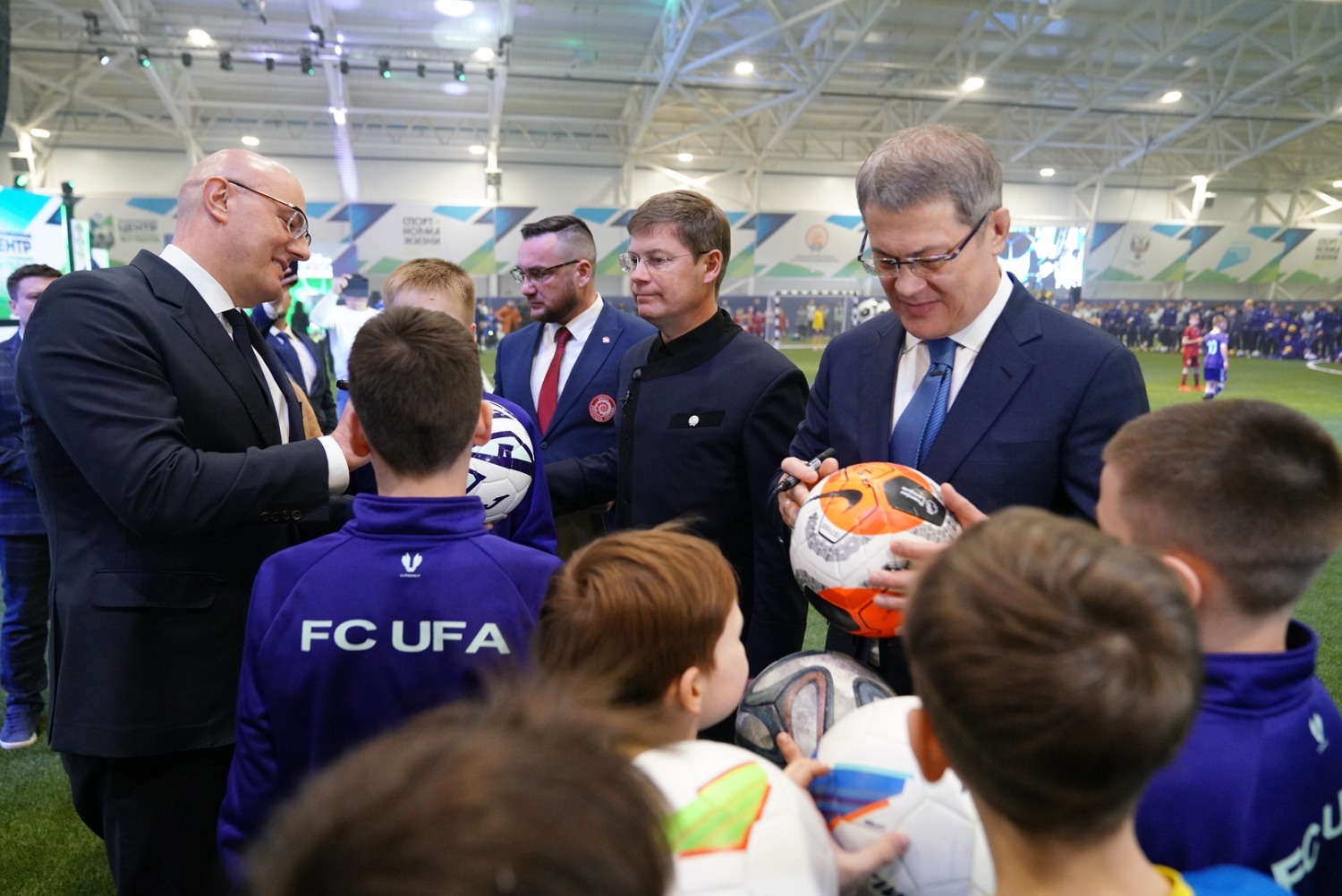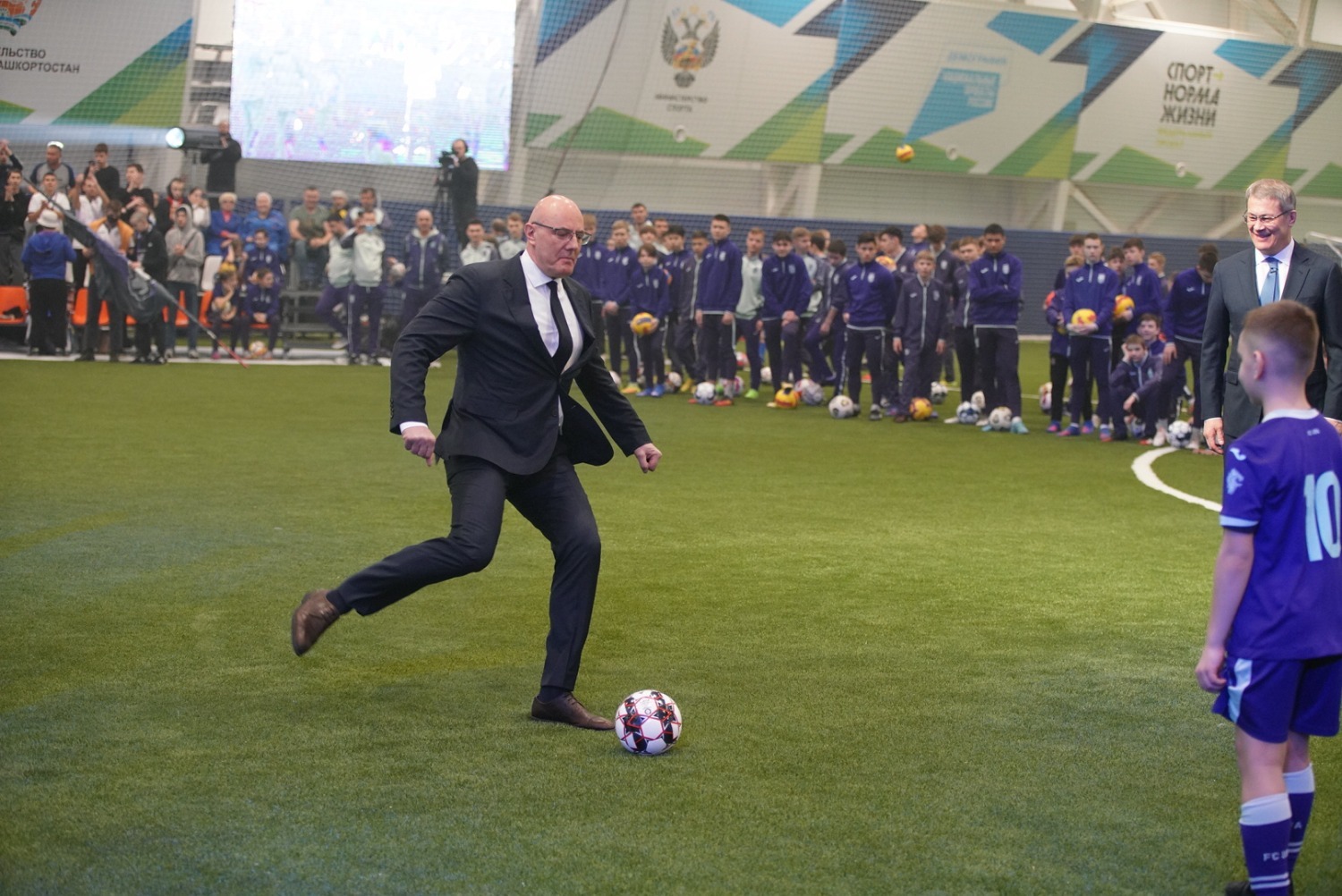 Заместитель председателя правительства РФ Дмитрий Чернышенко совместно с Главой Республики Башкортостан Радием Хабировым принял участие в открытии нового крытого футбольного манежа в Уфе и дал старт турниру фиджитал по футболу «Я – герой». Вице-премьер российского правительства и Глава региона также пообщались с детьми – участниками соревнований.