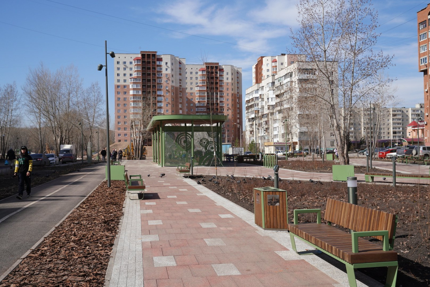 В створе домов по бульвару Баландина появился единый пешеходный сквер с местами для отдыха и общения, который направляет гостей пространства к озеру. Чтобы гулять в сквере было безопасно, автомобильные проезды перенесены вдоль жилых домов — так, чтобы они не пересекали пешеходные маршруты. В сквере установлены качели, организована зона отдыха и настольных игр у навеса с универсальным павильоном и санузлом, игровая зона с интерактивными элементами.