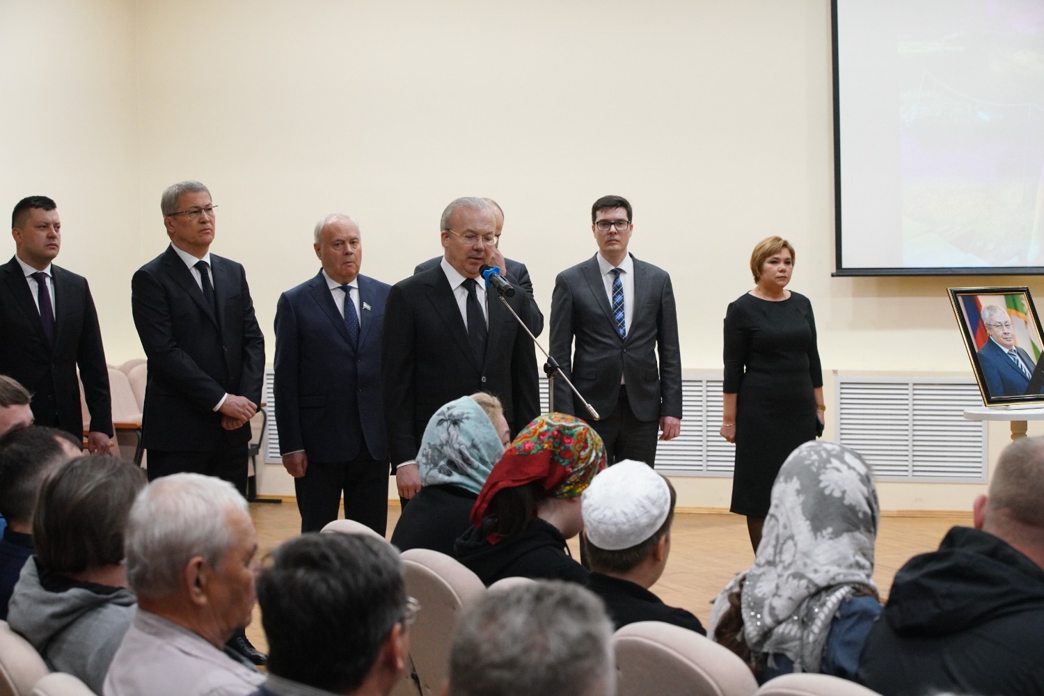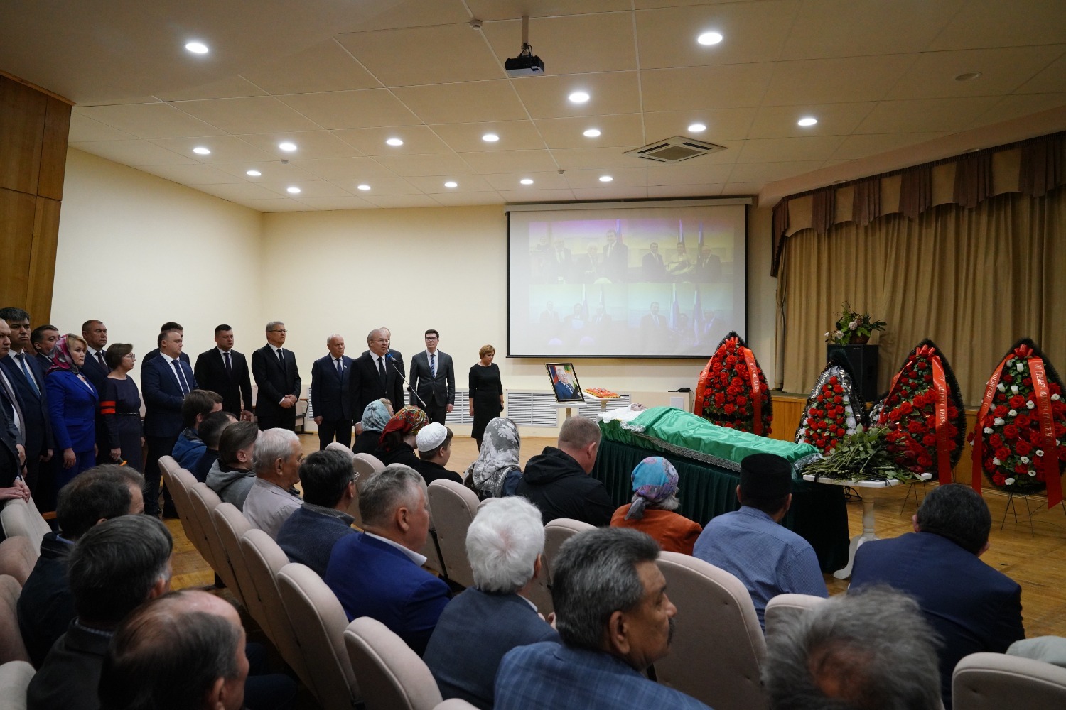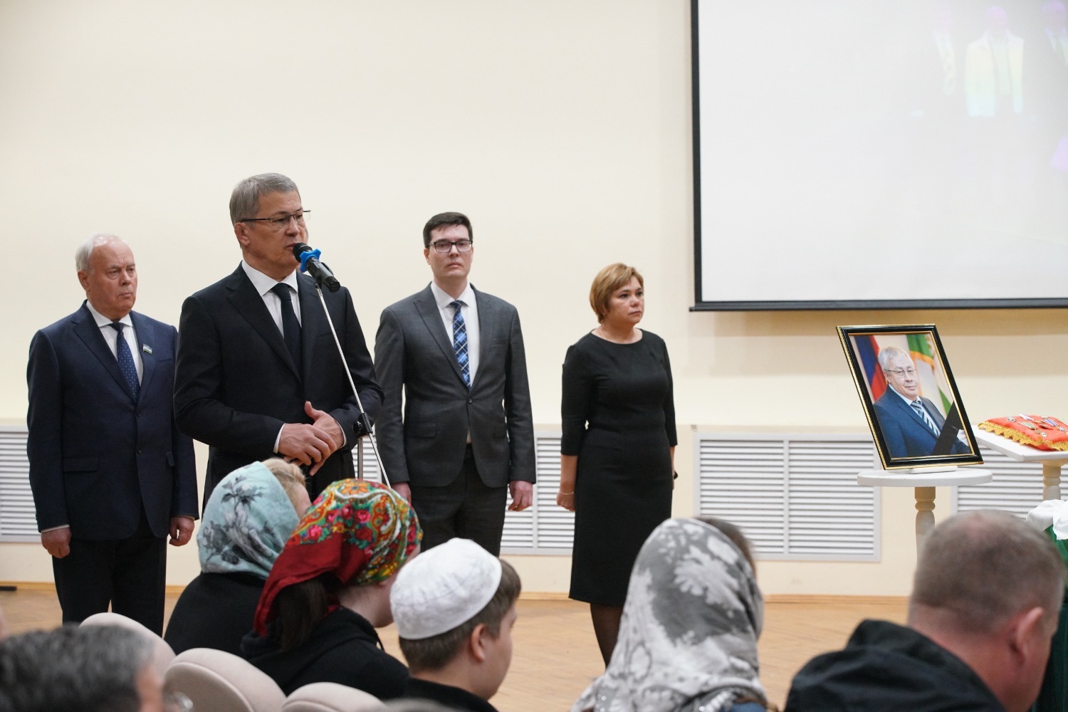 «Уважаемые товарищи! Уважаемые родные, близкие. Мы сегодня всей республикой провожаем Акрама Мухаметовича в последний путь. Он жил вместе с республикой, развивался вместе с ней, был её неотъемлемой частью. Он был нашим товарищем, принципиальным человеком, очень компетентным и хорошим руководителем.