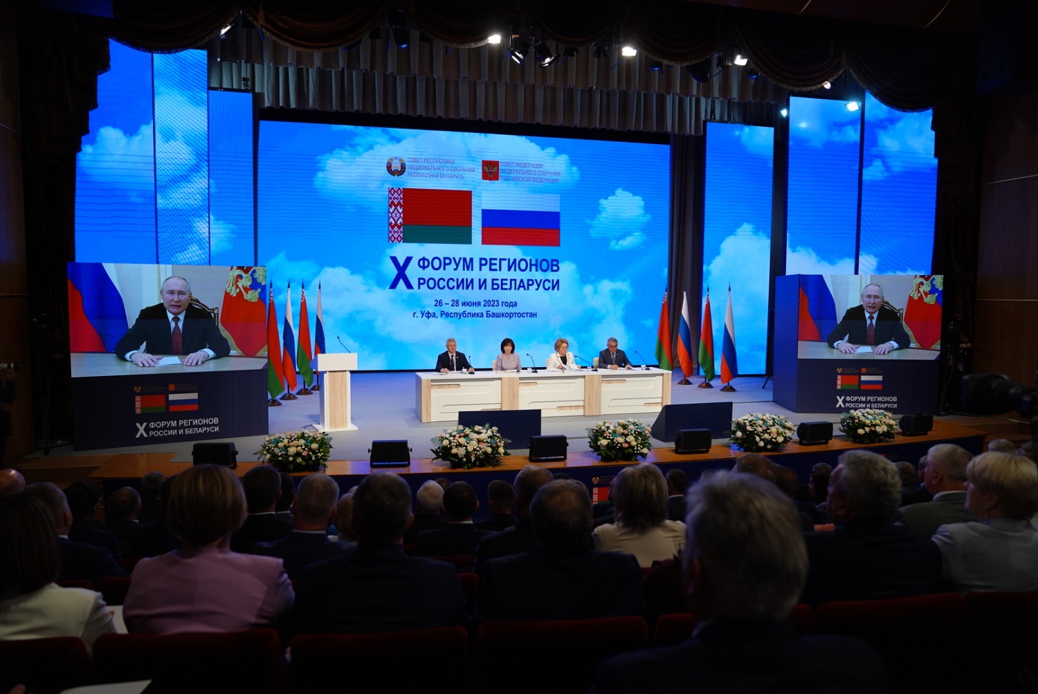 Путин обратил внимание на то, что межрегиональный форум «более 10 лет собирает глав регионов, парламентариев, руководителей министерств и ведомств, представителей деловых и экспертных кругов, общественных и молодежных организаций двух стран, то есть тех, кто реально, на деле занимается развитием дружественных и добрососедских российско-белорусских связей». Как сказал глава государства, на нынешний форум в Уфу приехали порядка 1 тыс. российских и белорусских делегатов.