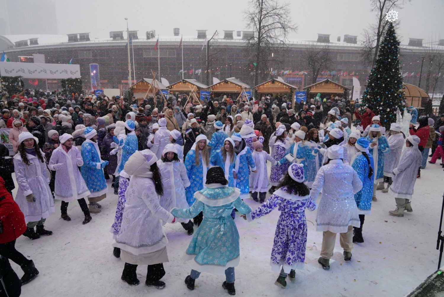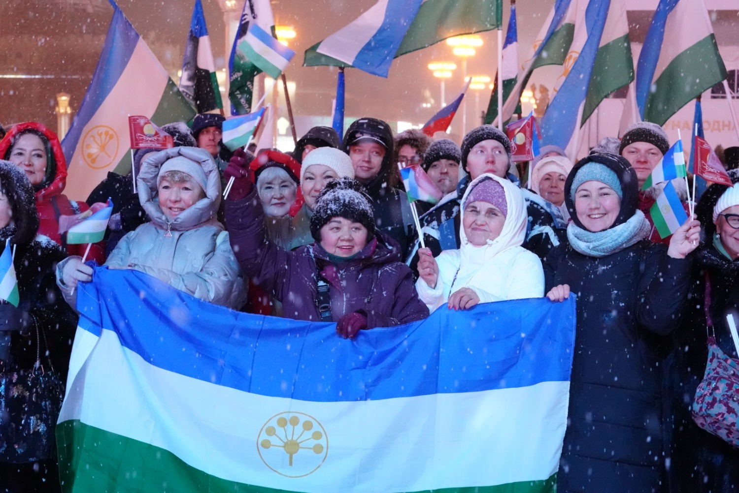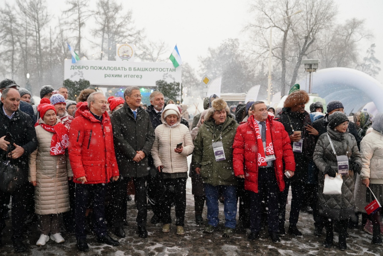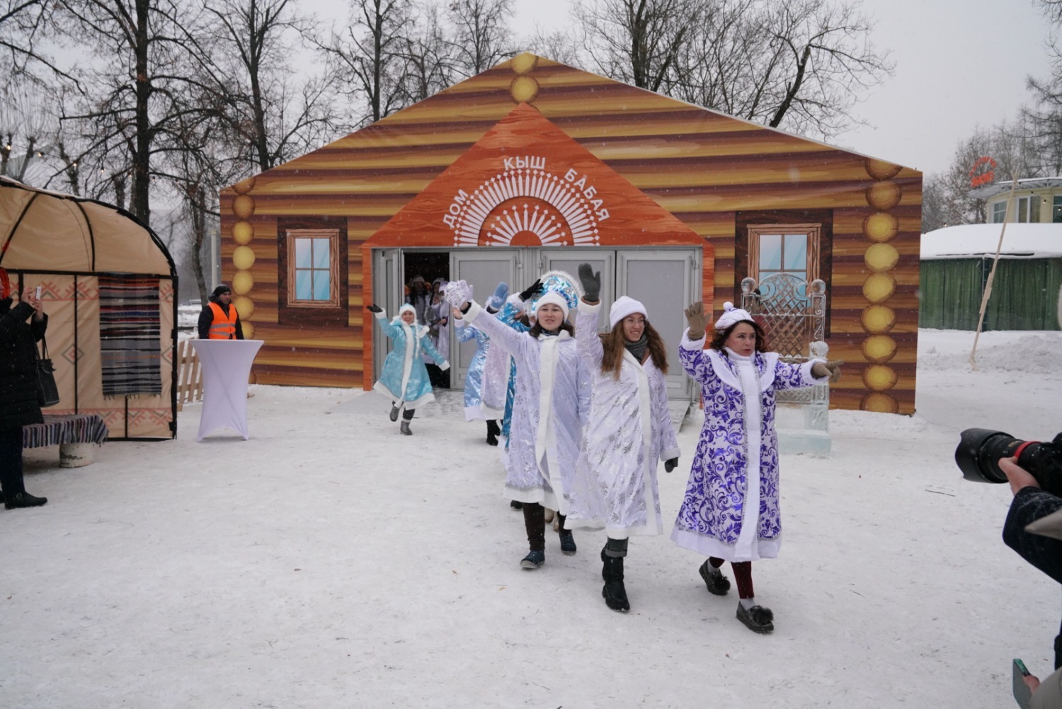 Далее Глава Башкортостана дал старт параду 100 снегурочек. Они приглашают юных гостей в новогодний дом Кыш-Бабая – башкирского Деда Мороза. На уличной площадке также прошел «Зимний сабантуй» – традиционный для башкир летний праздник превратился в зимние народные забавы для взрослых и детей. Всех гостей на улице угощали горячим башкирским чаем.