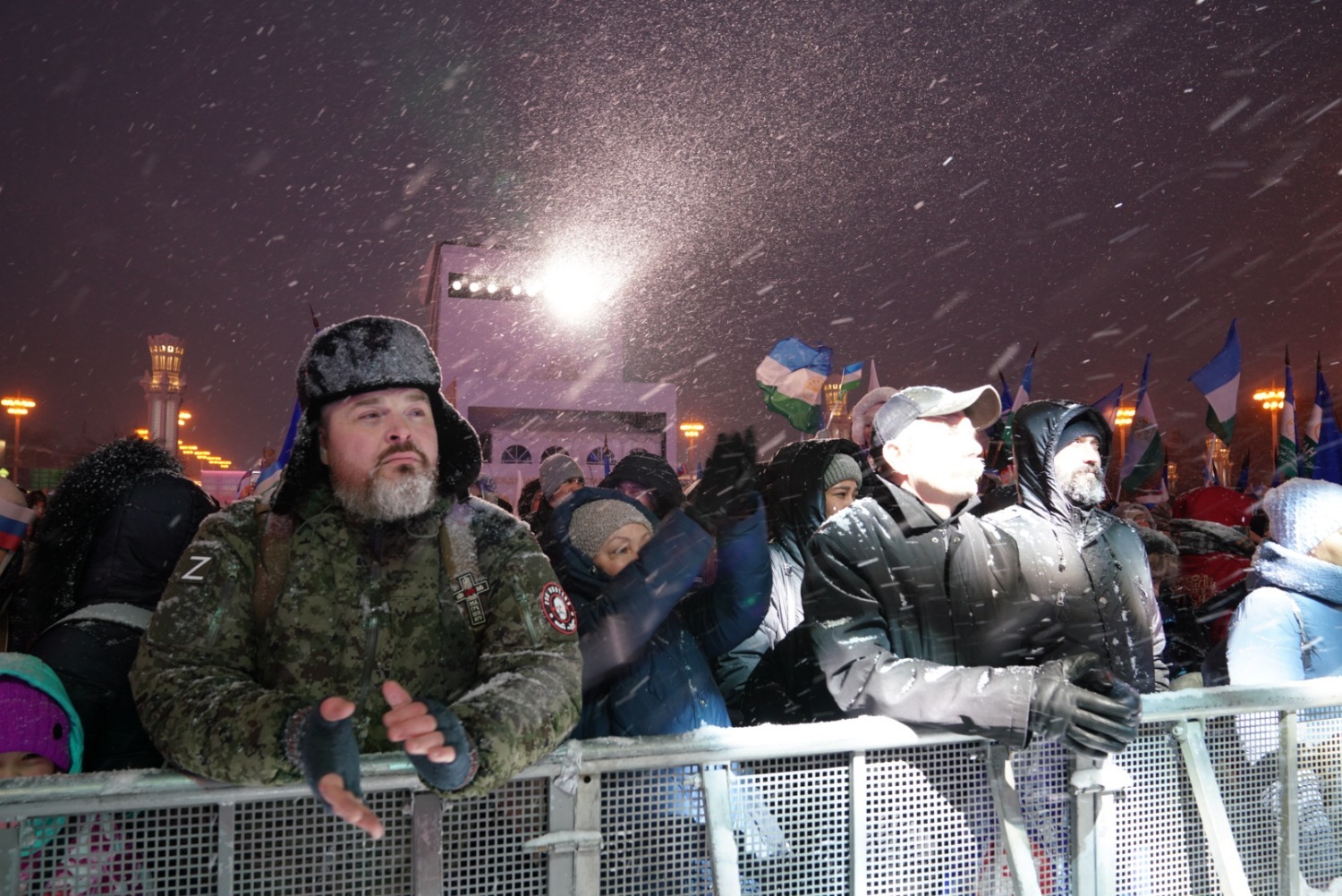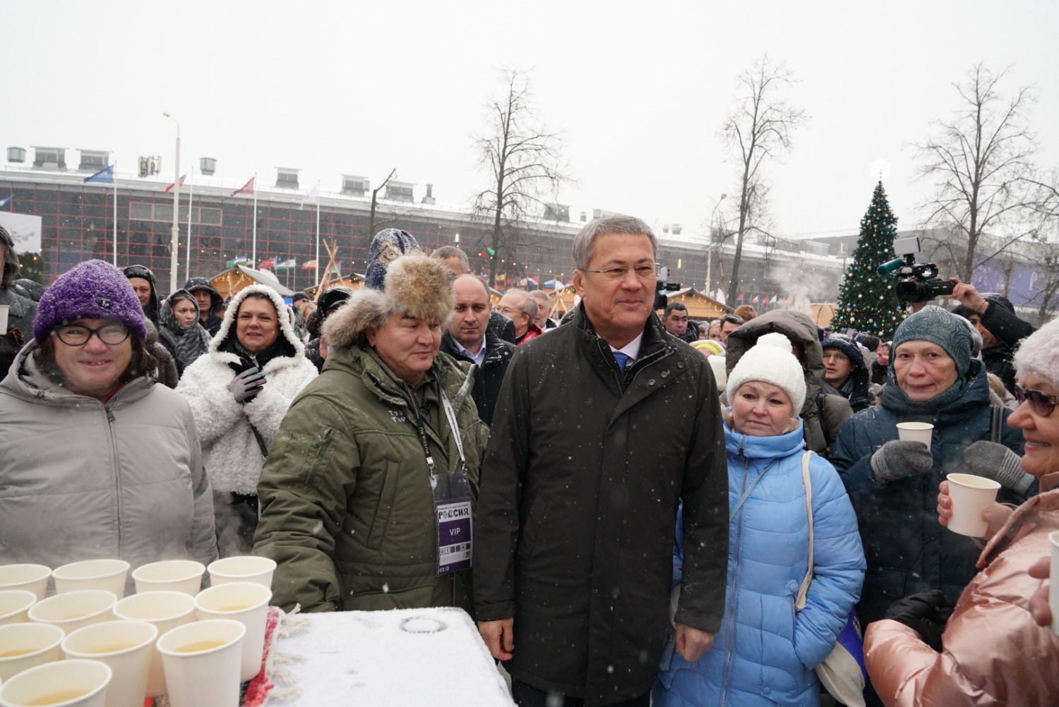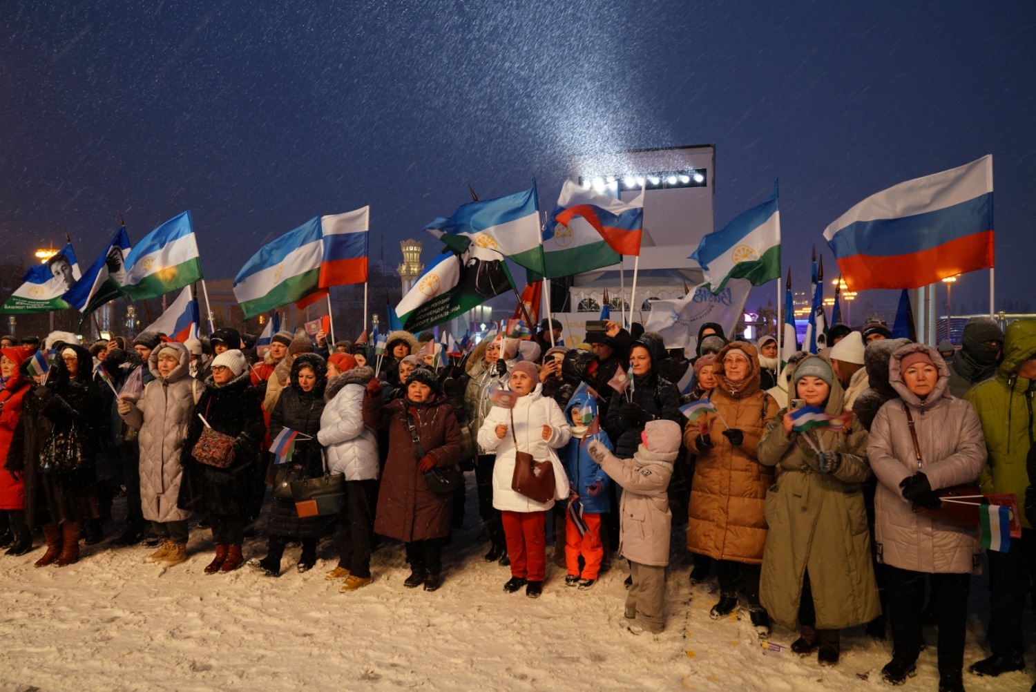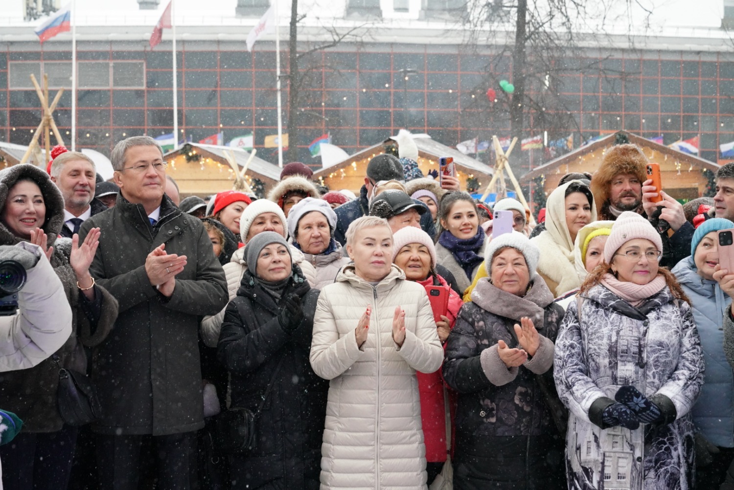 Далее Глава Башкортостана дал старт параду 100 снегурочек. Они приглашают юных гостей в новогодний дом Кыш-Бабая – башкирского Деда Мороза. На уличной площадке также прошел «Зимний сабантуй» – традиционный для башкир летний праздник превратился в зимние народные забавы для взрослых и детей. Всех гостей на улице угощали горячим башкирским чаем.
