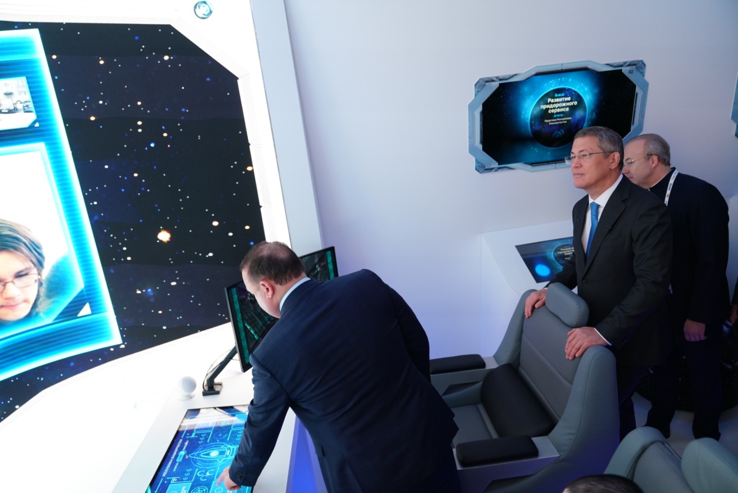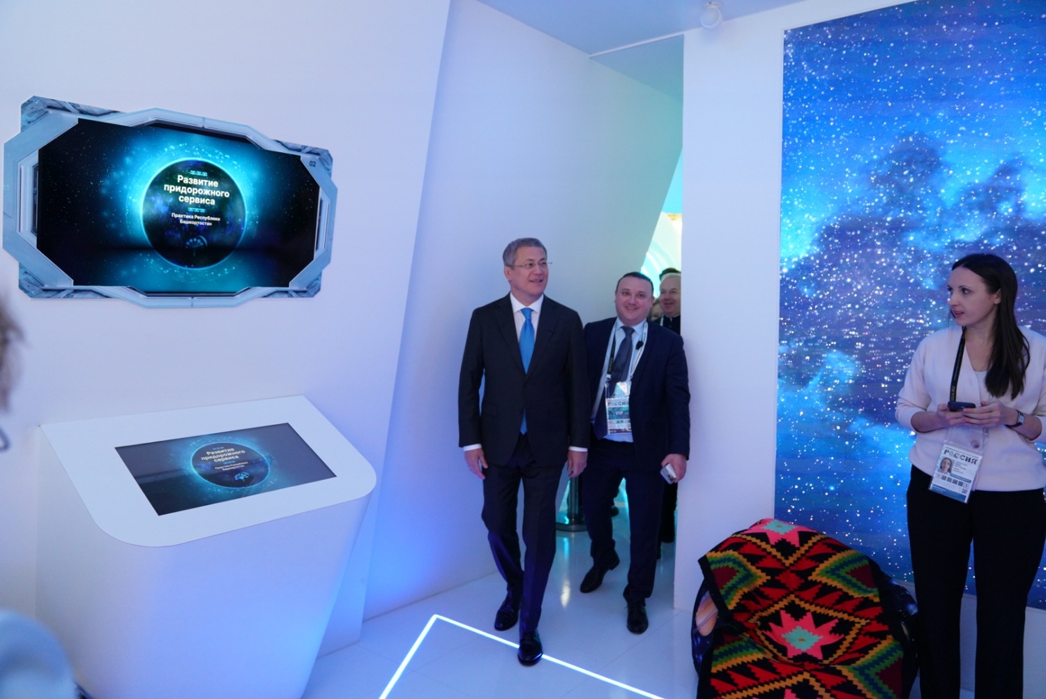 Глава Башкортостана осмотрел и стенд республики. Экспозицию организовали с применением новейших технологий 3D-печати. По задумке авторов, стенд представляет собой космический корабль, устремлённый в будущее вместе со всей Россией, которая движется к новым достижениям и инновациям.