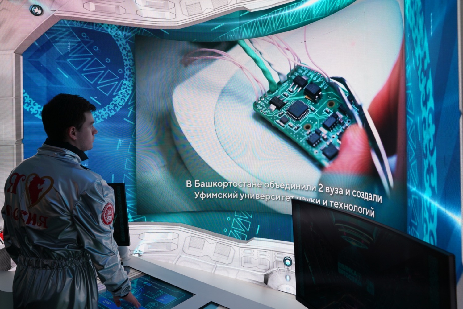 А в интерактивной зоне можно поучиться управлять беспилотным аппаратом вертолетного типа и протестировать новую игру «Академия», созданную на киберфизической платформе «Берлога». По периметру стенда разместили голограммы герба Башкортостана, а также известных уроженцев республики: дирижёра Владимира Спивакова, артиста балета Рудольфа Нуриева, писателей Сергея Аксакова и Сергея Довлатова.
