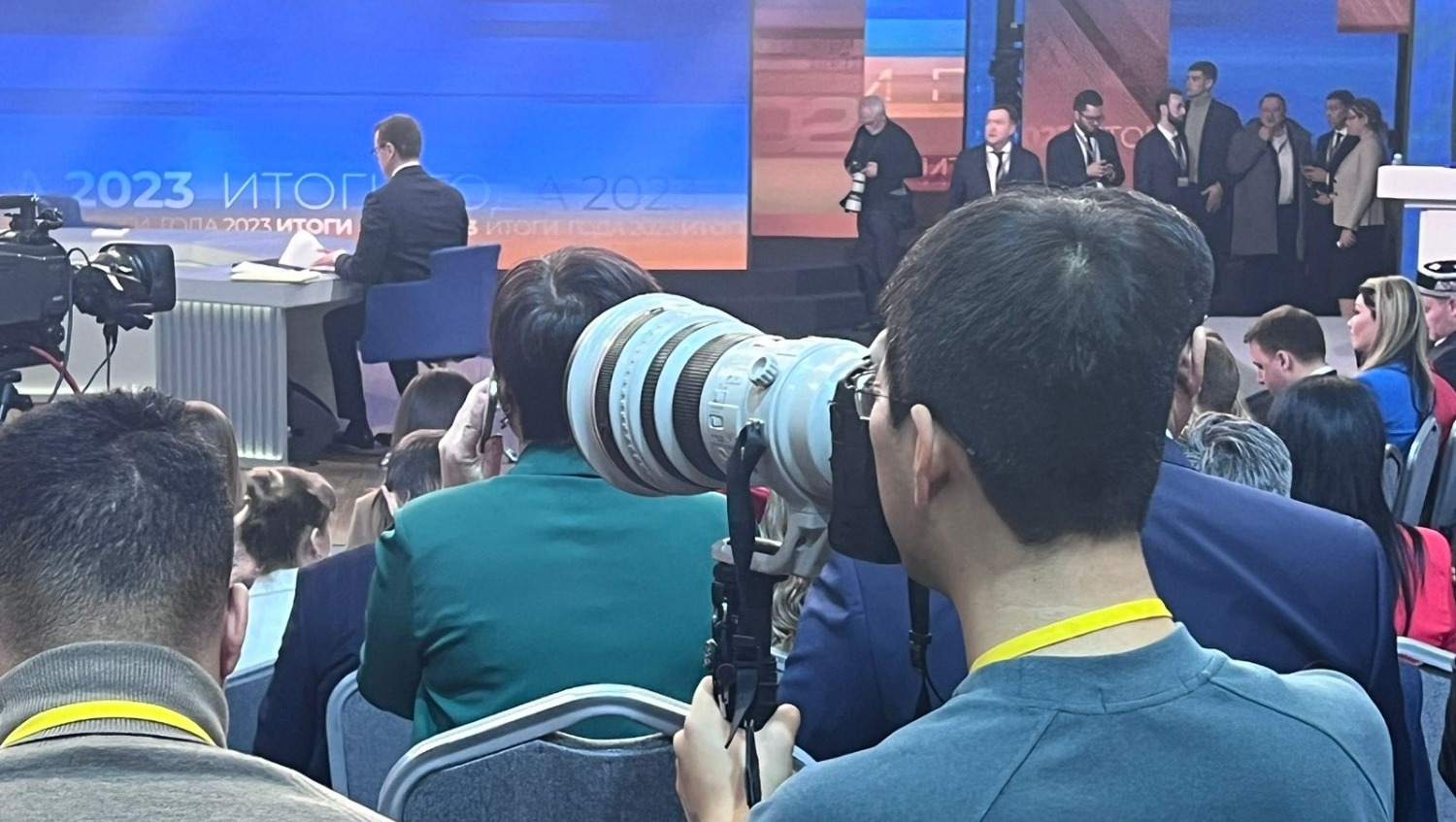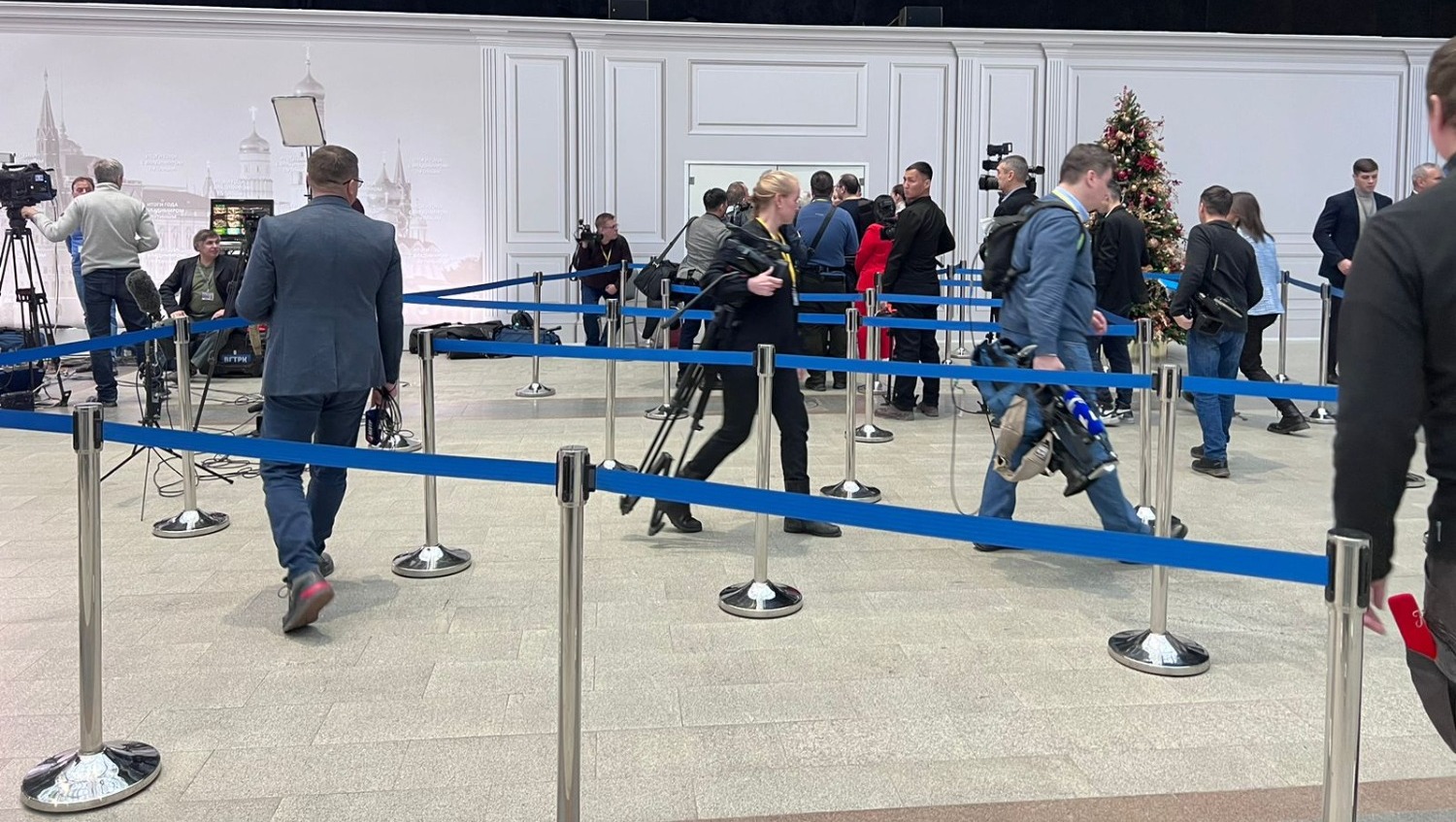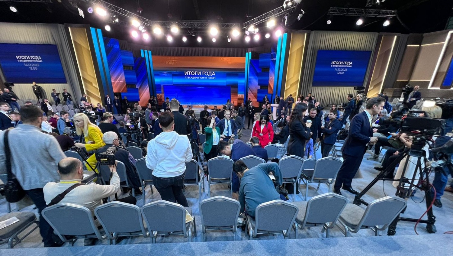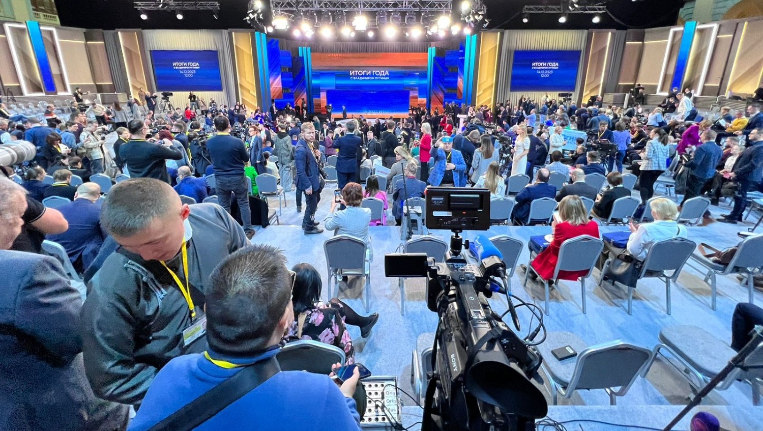 В сам зал пресс-конференции начали запускать в 11.10 (по мск) – в первых рядах потолкалась с коллегами в змеевидном коридорчике. Поговорила с ведущей НТВ Ирадой Зейналовой, она сказала, какие вопросы ждет от регионов. Наконец-то, внутри. Заняла неплохое, как казалось, место – прямо в «партере», в шестом ряду - перед президентом. Но, как показали 4 часа, надо было ближе к трибуне пресс-секретаря Дмитрия Пескова садиться – там задавали больше всех вопросов.