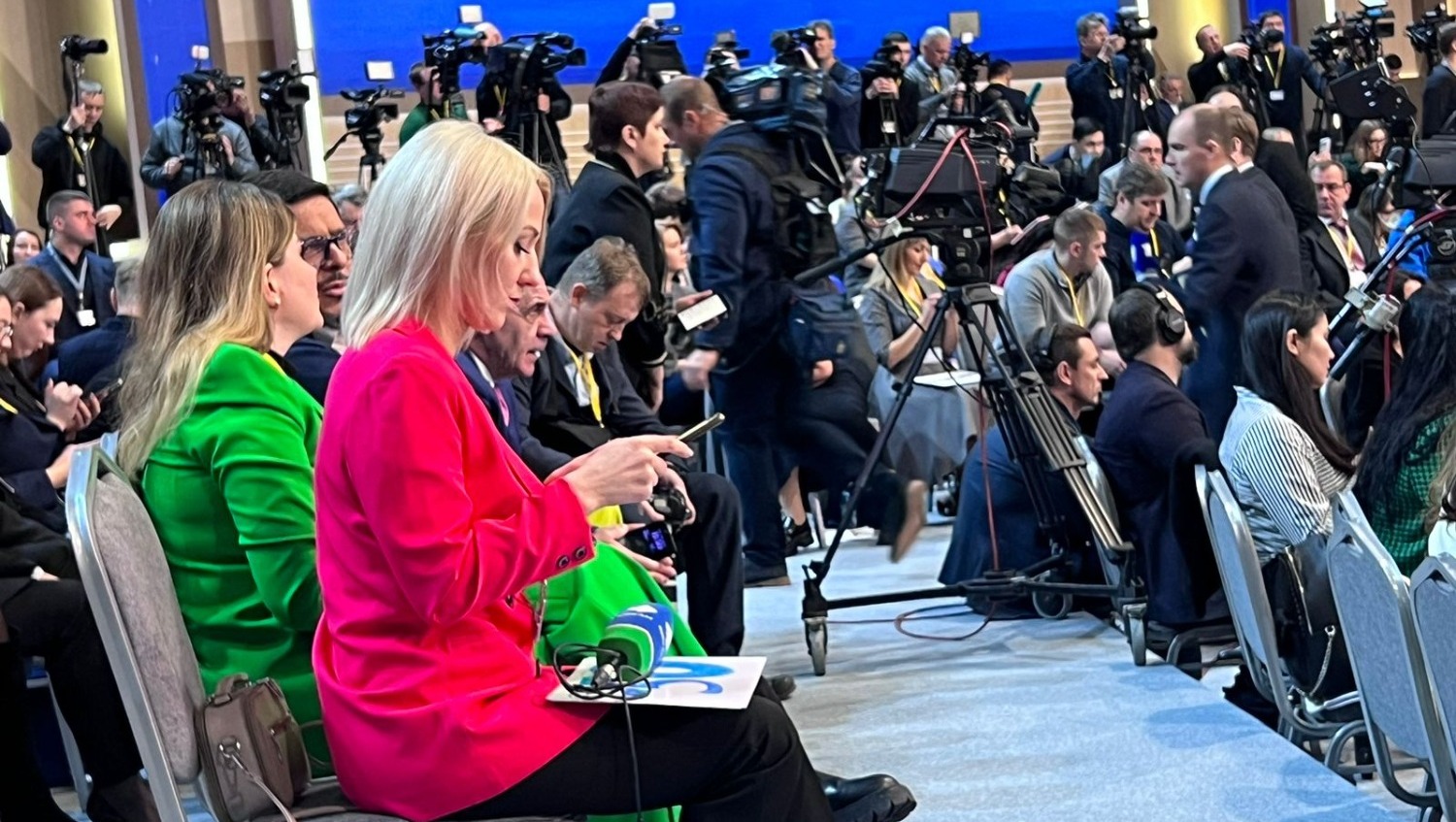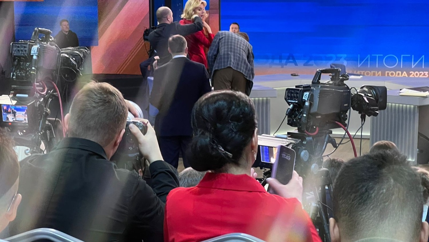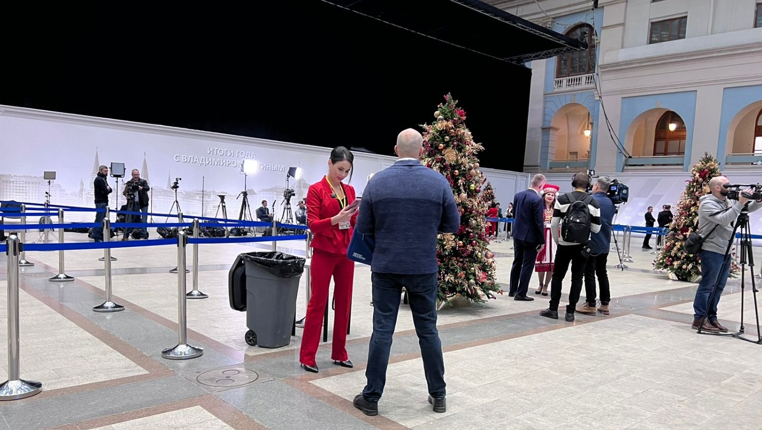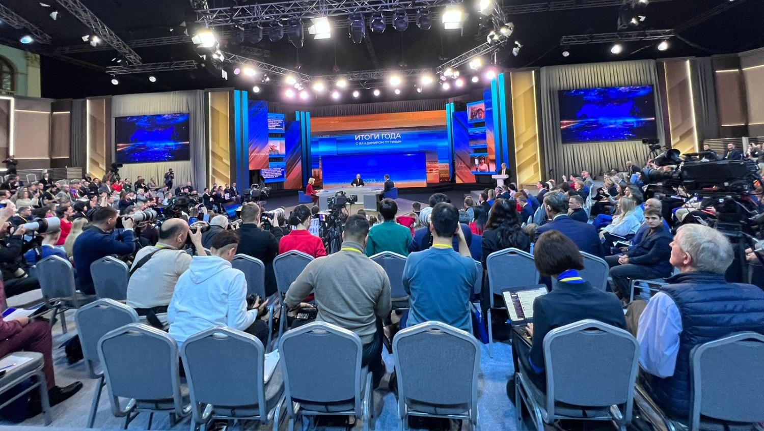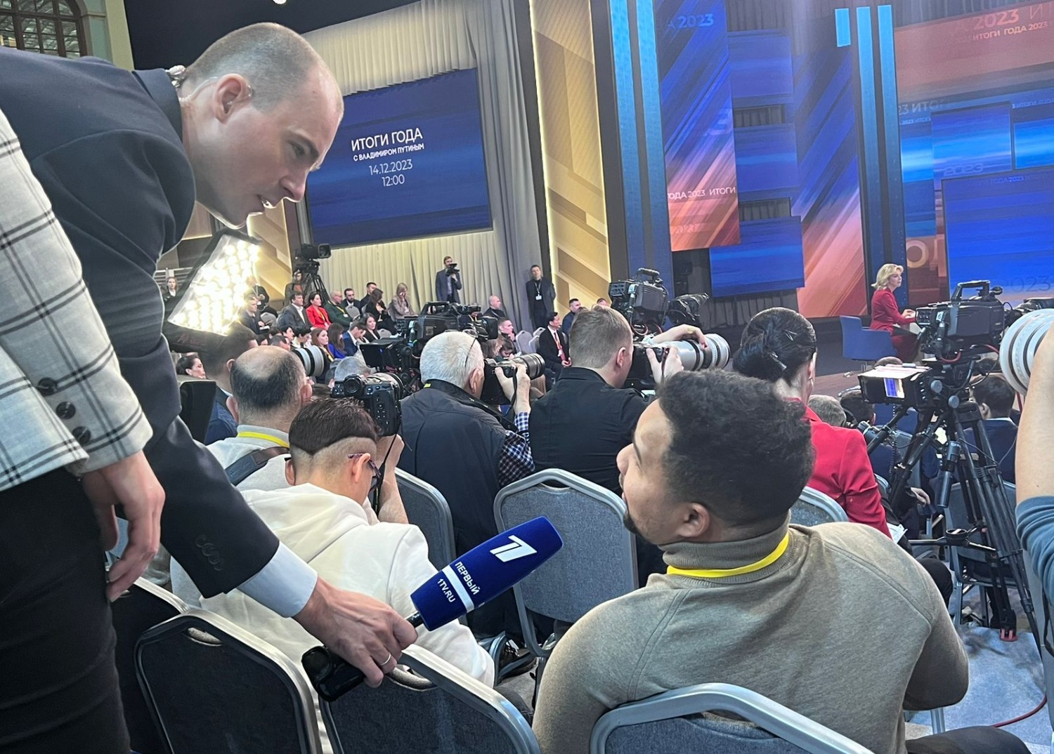 В сам зал пресс-конференции начали запускать в 11.10 (по мск) – в первых рядах потолкалась с коллегами в змеевидном коридорчике. Поговорила с ведущей НТВ Ирадой Зейналовой, она сказала, какие вопросы ждет от регионов. Наконец-то, внутри. Заняла неплохое, как казалось, место – прямо в «партере», в шестом ряду - перед президентом. Но, как показали 4 часа, надо было ближе к трибуне пресс-секретаря Дмитрия Пескова садиться – там задавали больше всех вопросов.